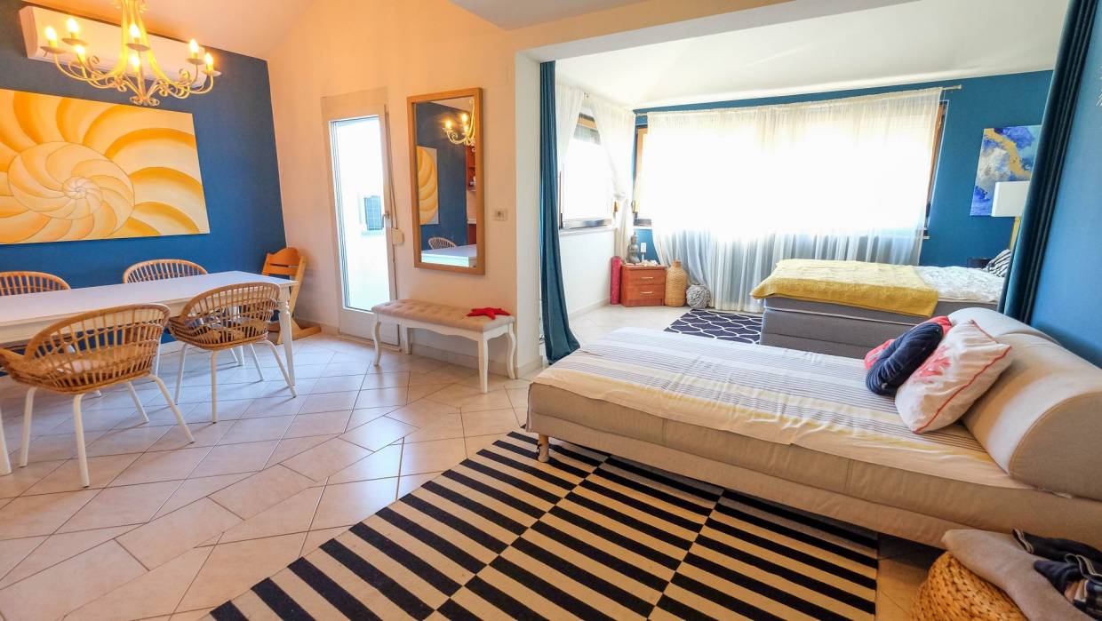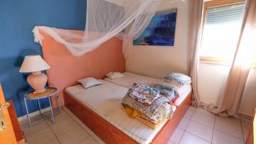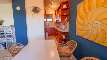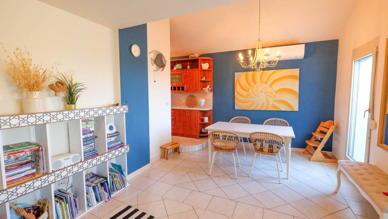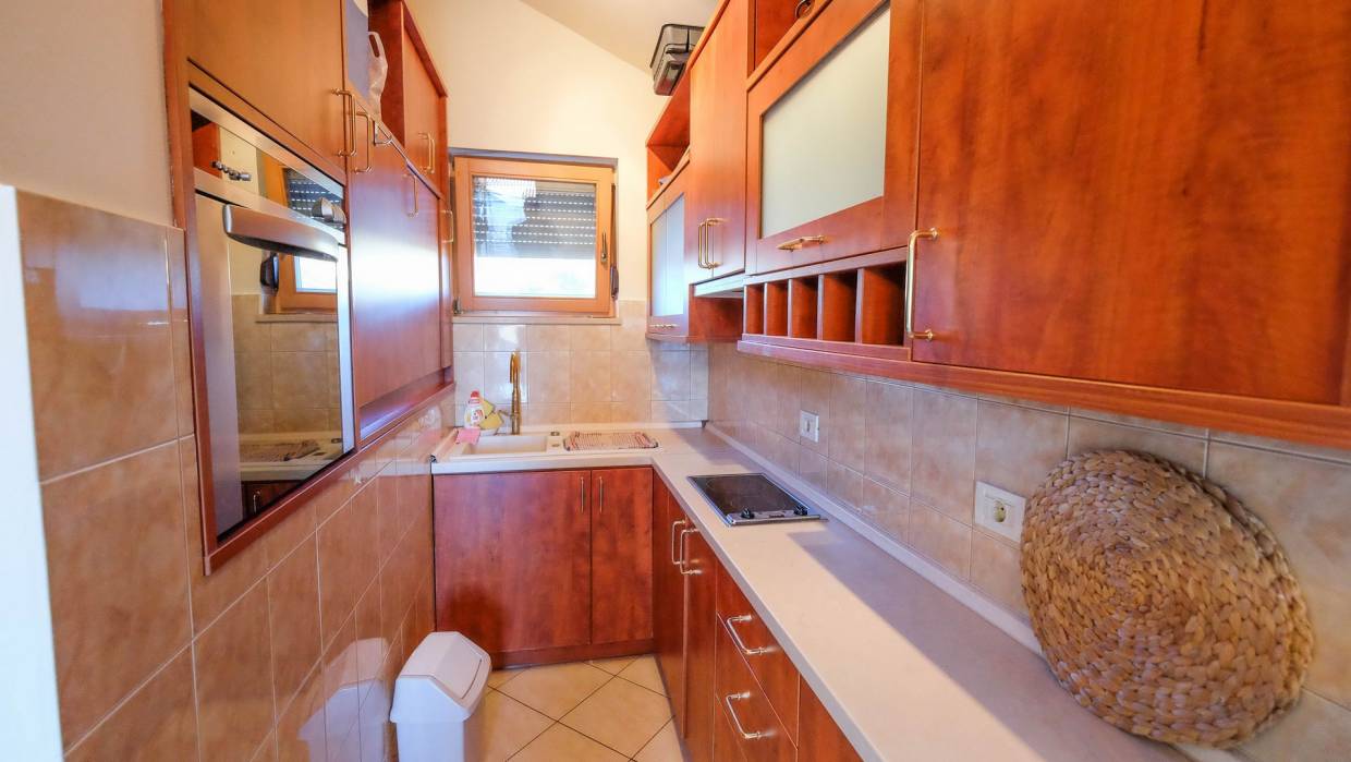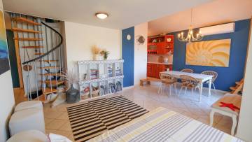 Premantura, prekrasan dvosobni stan s pogledom na more i 400 od plaže. Stan se sastoji od kuhinje s blagovaonicom i dnevnog boravka, spavaće sobe, terase i kupaonice na prvoj ezaži, te druge spavaće sobe i toaleta na drugoj etaži. Stanu pripada i garaža. Prodaje se potpuno namješten.