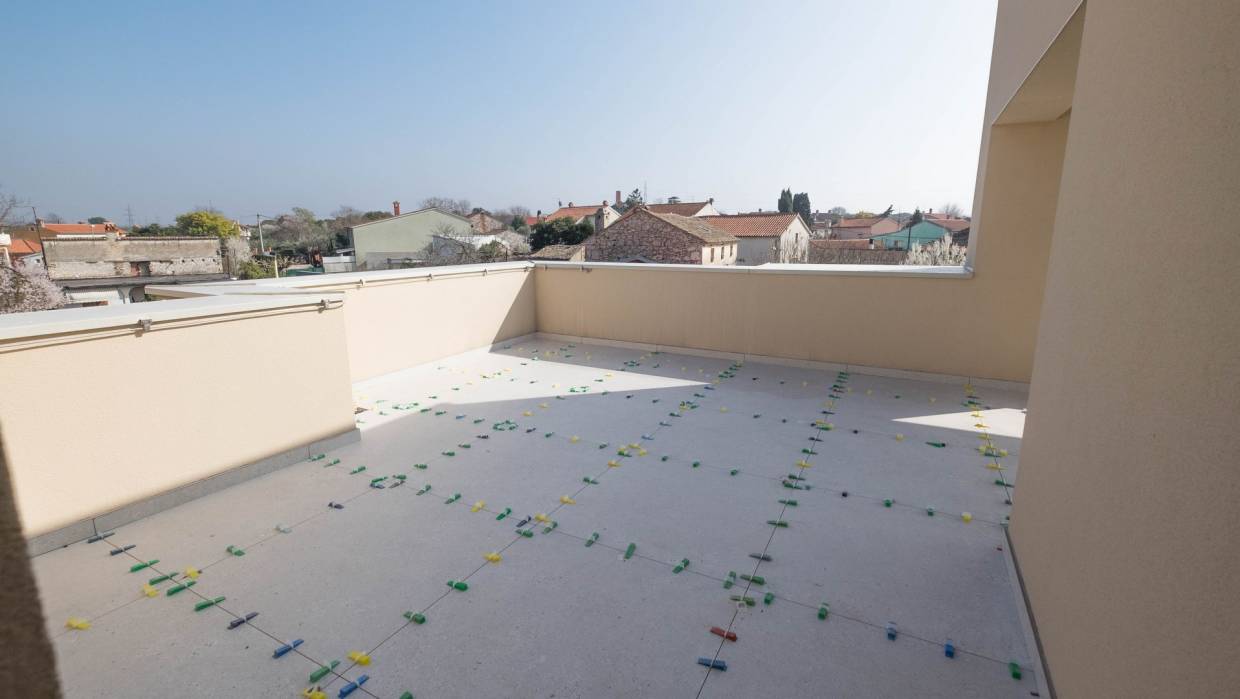 Pula - Valdebek, luksuzn dvosoban stan u izgradnji ukupne površine 80 m2 na drugom katu. Stan se sastoji od ulaznog prostora, dvije spavaće sobe, dnevnog boravka s kuhinjom i blagovaonicom i loggis. Stanu pripada krovna terasna površine 48 m2 i vanjsko parkirno mjesto.