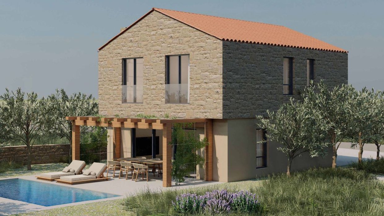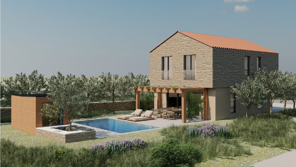 Na emljištu je predviđena gradnja samostojeće kuće na načine, prizemlje i kat ukupno 120 m2 neto, pomoćnih građevina - vanjski bazen, spremište sa bazenskom tehnikom, biološki pročistač, predviđena su 2 parkirna mjesta.