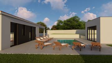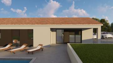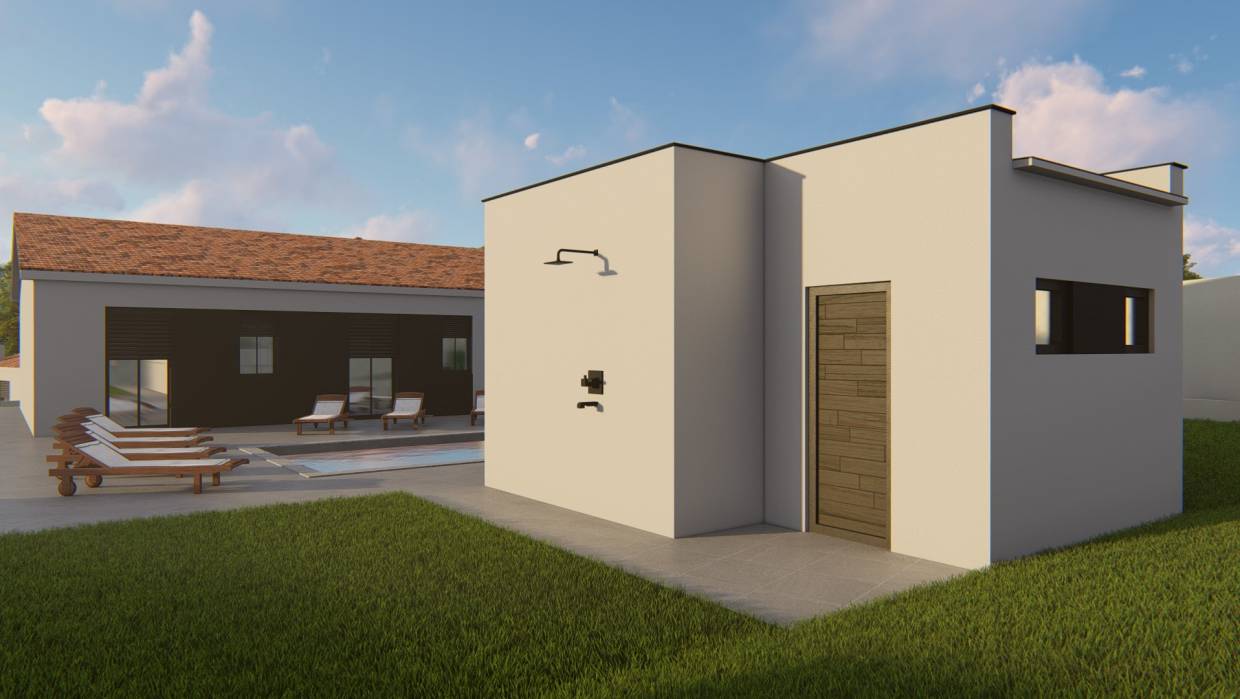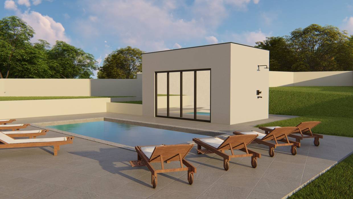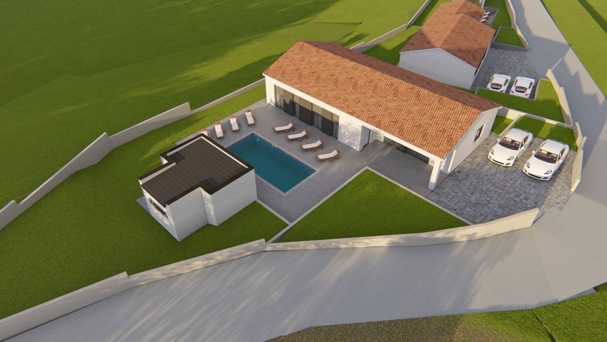 Na prodaju kuća površine 110,90 m² s bazenom, smještena na zemljištu ukupne površine 891 m². Na parceli se nalaze priključci za vodu i struju. U cijenu je uključena izrada kuće “ključ u ruke”.