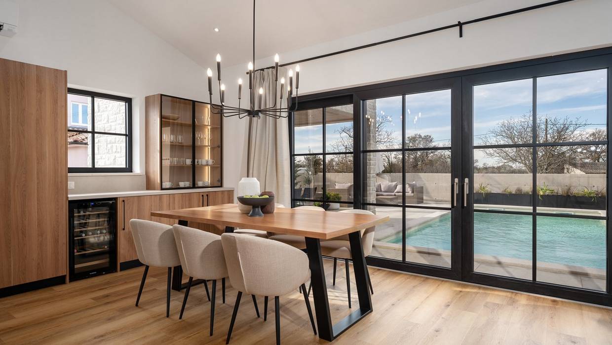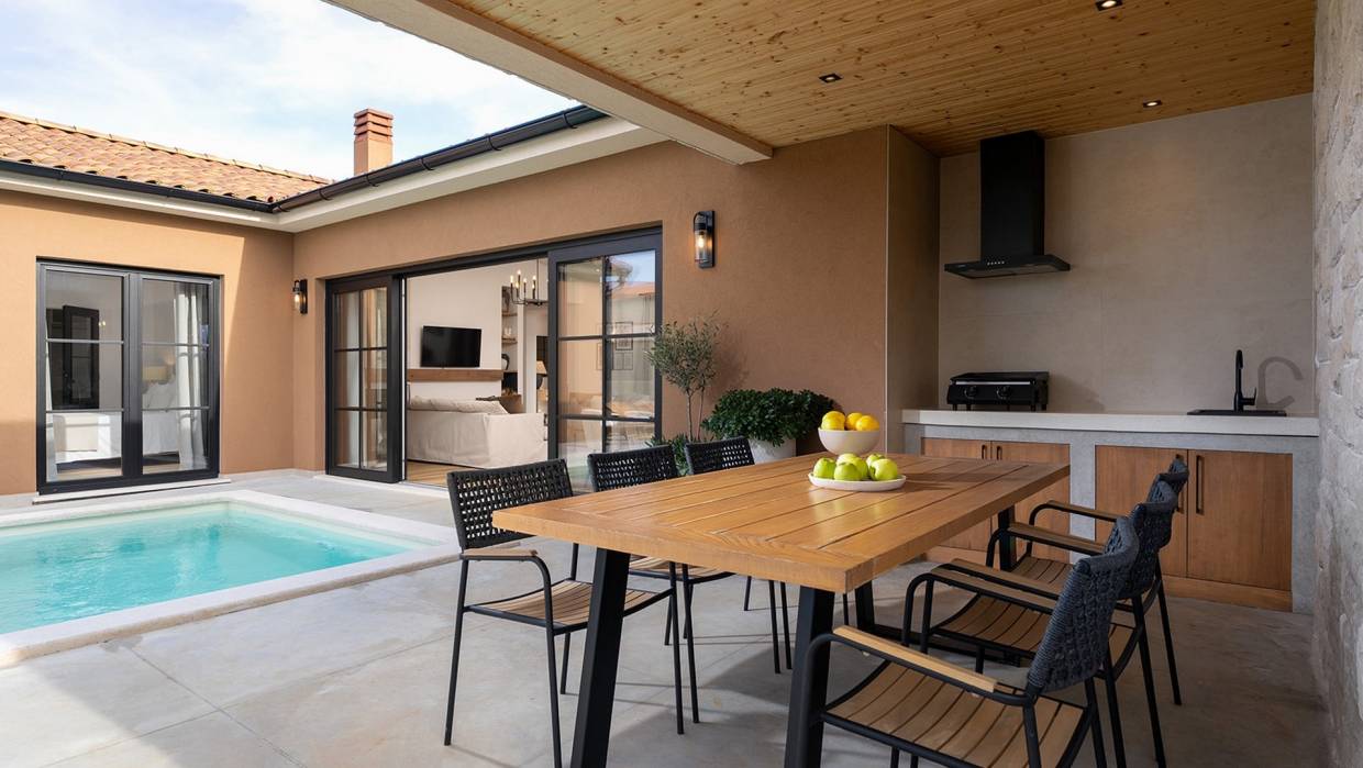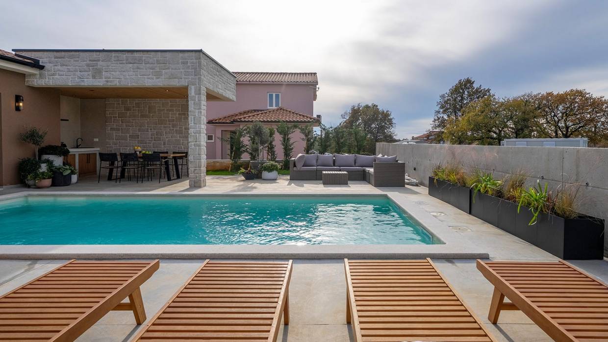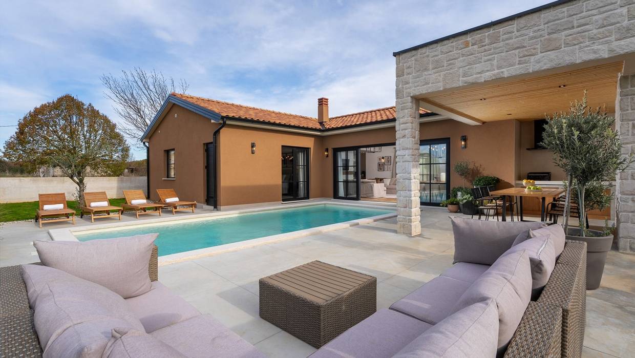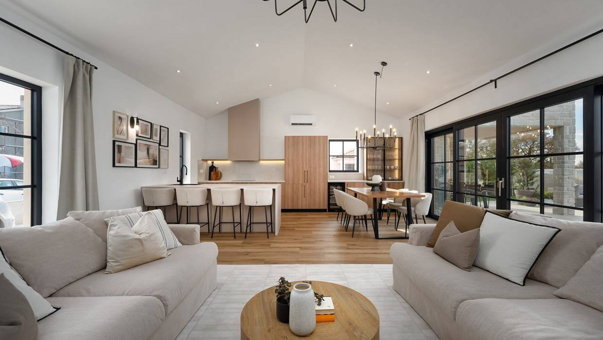 Šarmantna prizemnica s bazenom, osmišljena kao spoj suvremenog dizajna i istarske tradicije. Prostrani open-space dnevni dio objedinjuje dnevni boravak, kuhinju i blagovaonicu te pruža osjećaj udobnosti, prozračnosti i funkcionalnosti. U privatnom dijelu kuće nalaze se dvije udobne spavaće sobe, svaka s vlastitom kupaonicom, dok glavna soba dodatno raspolaže praktičnim walk-in ormarom. Tu su i odvojeni vešeraj te gostinjski toalet, što čini kuću iznimno praktičnom za svakodnevni život. Interijer je uređen s posebnom pažnjom — kombinacija rustikalnih i modernih elemenata stvara topao, elegantan i skladan ambijent. Većina namještaja izrađena je po mjeri radi maksimalne funkcionalnosti i estetike, a nekretnina se prodaje potpuno namještena. Uređeni eksterijer upotpunjuju bazen, sunčalište, natkrivena terasa i ljetna kuhinja. Okućnica zahtijeva minimalno održavanje, a pruža sve što je potrebno za opuštanje i uživanje tijekom cijele godine. Za grijanje i hlađenje ugrađeno je podno grijanje u cijeloj kući te klima uređaji.