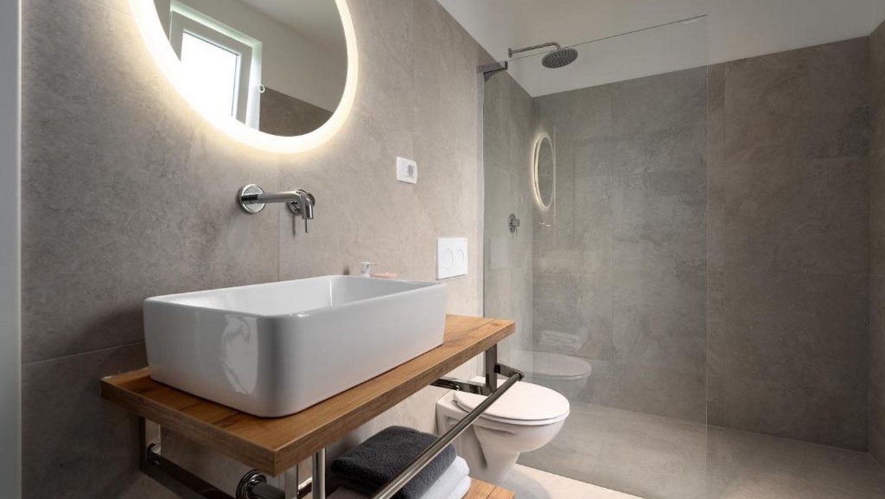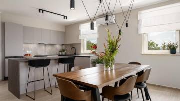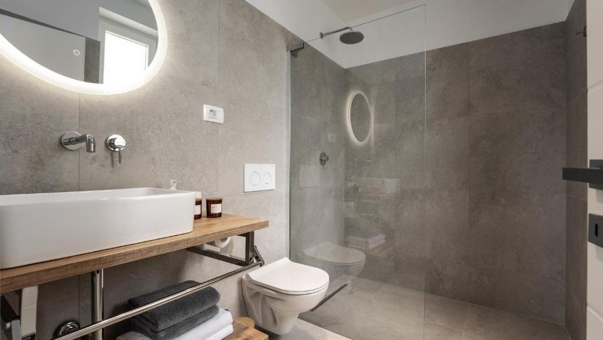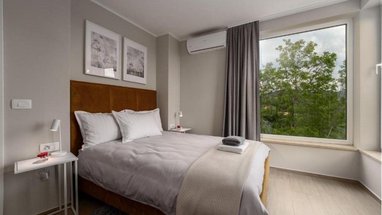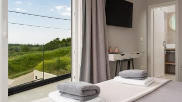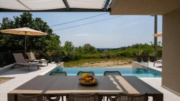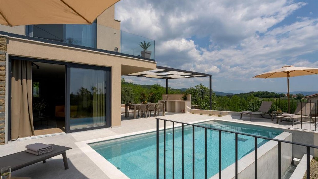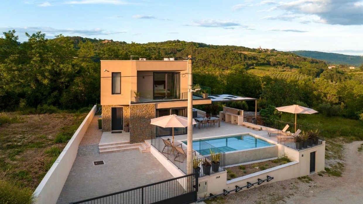 Samostojeća kuća s bazenom smještena je na vrhu brda, okružena predivnim zelenilom Istre, te pruža nesmetan pogled na more i planine. Izgrađena je na parceli od 328 m², a ukupna stambena površina iznosi 85 m². U prizemlju se nalazi prostrani open-space dnevni boravak s moderno opremljenom kuhinjom i blagovaonicom, kupaonica te ostava. Na katu su tri udobne spavaće sobe, dvije kupaonice i balkon s predivnim pogledom na istarsku prirodu. U dvorištu se prostire velika terasa s tendom, vanjska kuhinja s roštiljem, jacuzzi te bazen površine 25 m². Kuća je opremljena podnim grijanjem na dizalicu topline, klima uređajima u svim prostorijama, te ima četiri parkirna mjesta.