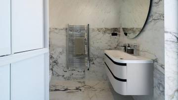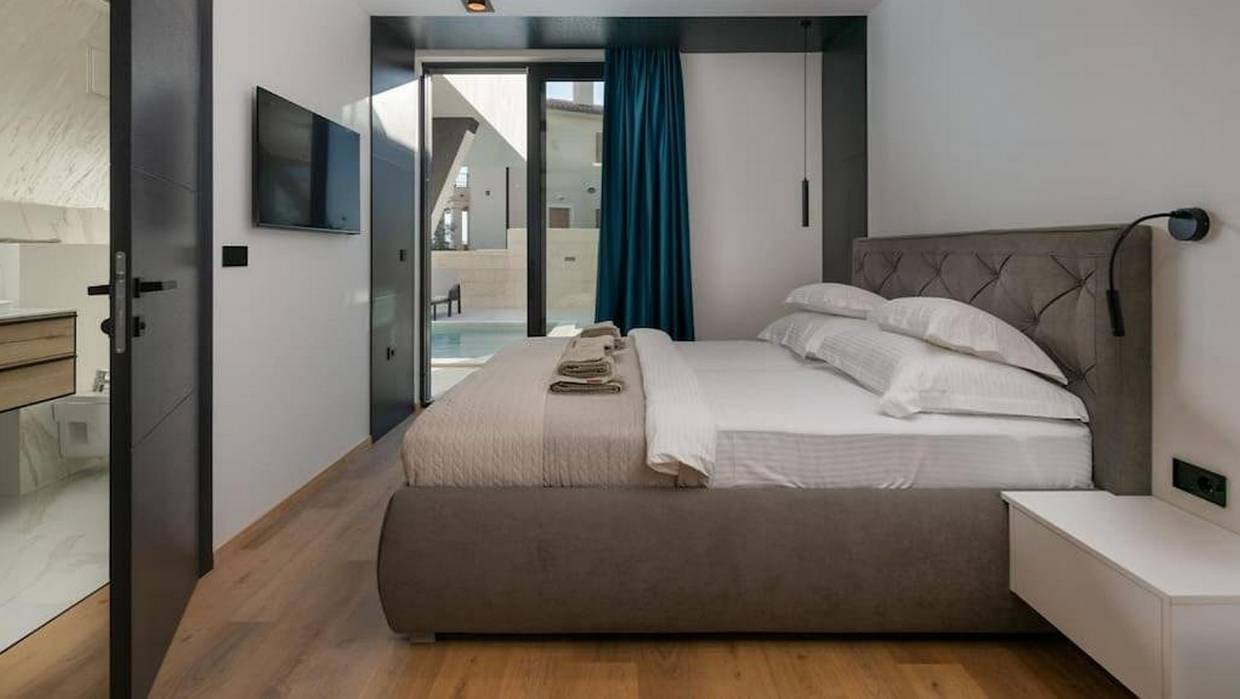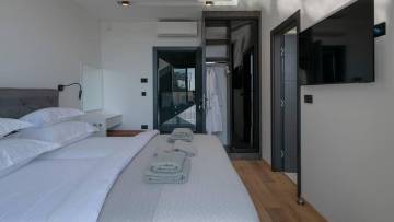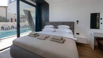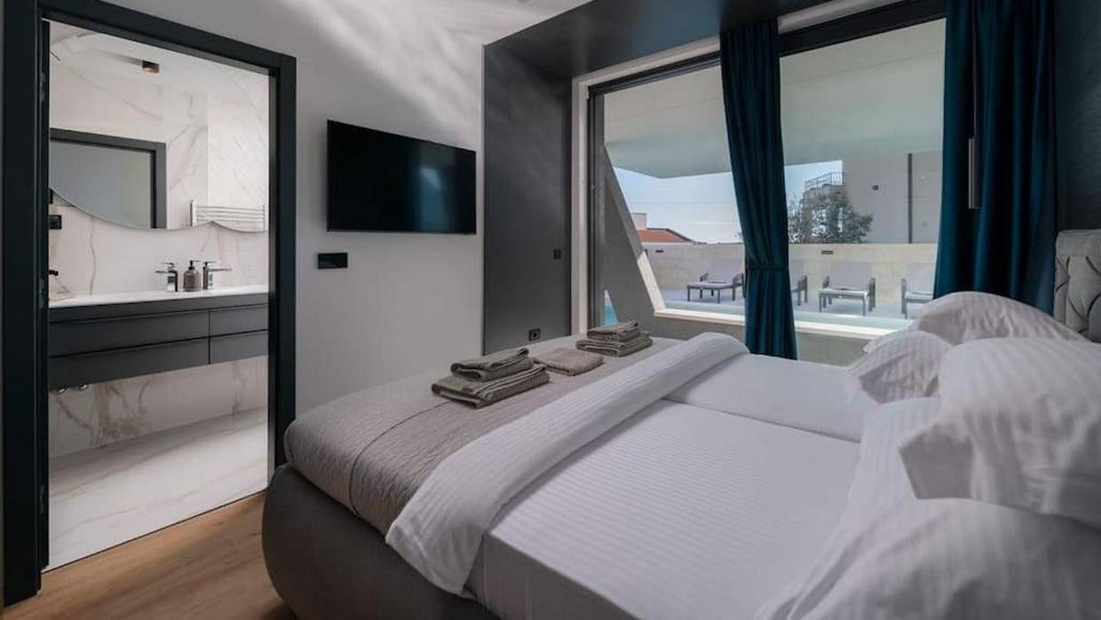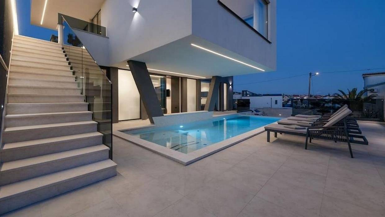 Kuća se sastoji od četiri etaže, međusobno povezane unutarnjim stubištem i panoramskim dizalom.U suterenu se nalazi prostrana prostorija namijenjena druženju, opremljena kuhinjom i toaletom. Prizemlje čini veliki otvoreni koncept dnevnog boravka s kuhinjom i blagovaonicom, uz spavaću sobu i kupaonicu. Velike staklene stijene povezuju unutarnji prostor s vanjskim dijelom dvorišta u kojem se nalazi bazen sa sunčalištem. Na prvom katu nalazi se još jedan prostrani dnevni boravak s kuhinjom, spavaća soba i kupaonica. Terase na obje strane kuće pružaju prekrasan pogled na izlazak i zalazak sunca. Na najvišoj etaži smještena je dodatna spavaća soba s vlastitom kupaonicom te prostrana wellness zona i krovna terasa s očaravajućim pogledom na more.