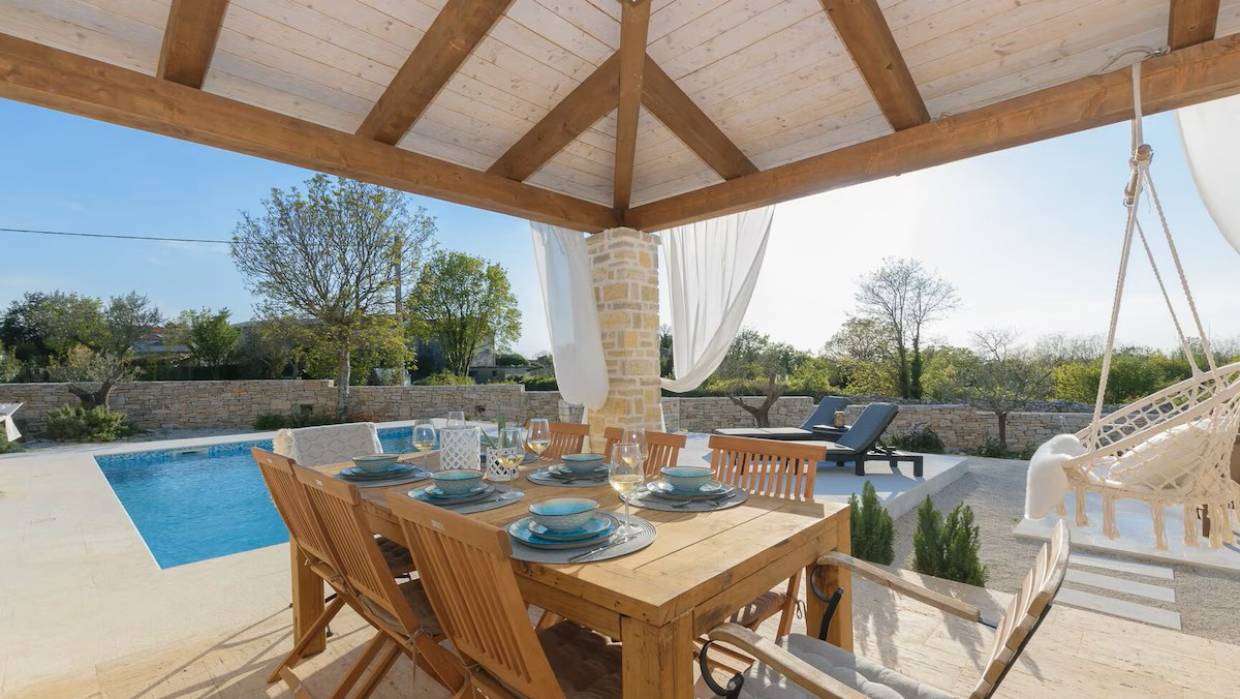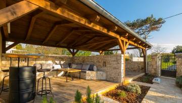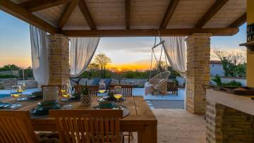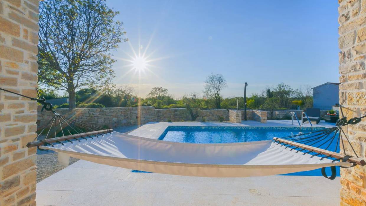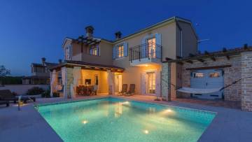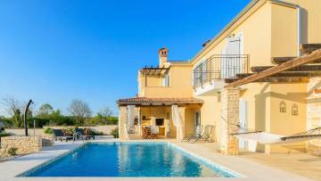Prekrasna istarska vila s bazenom i pogledom na more. Odlična kvaliteta, samo je nešto keramike u kupaonici a svi ostali materijali su vrhunski u kamenu i drvetu, uglavnom ručno izrađeni. U prizemlju se nalazi dnevni boravak s kuhinjom te jedna spavaća soba s kupaonicom i velikom ostavom dok su na prvom katu tri spavaće sobe i tri kupaonice. Prodaje se namještena.