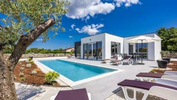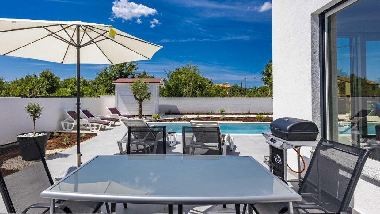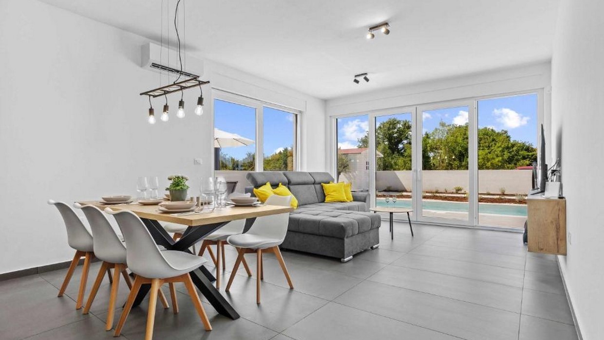 Prekrasna prizemnica s bazenom smještena je na mirnoj lokaciji u okolici Svetvinčenta. Stambena površina od 140 m² sastoji se od hodnika, dnevnog boravka, kuhinje s blagovaonicom, praonice, tri spavaće sobe i tri kupaonice. Iz kuhinje i dnevnog boravka izlazi se na terasu. Na okućnici površine 680 m² nalaze se veliki bazen, sunčalište te parkirna mjesta s mogućnošću punjenja električnih automobila. Kuća je klimatizirana te se prodaje potpuno namještena i spremna za korištenje.