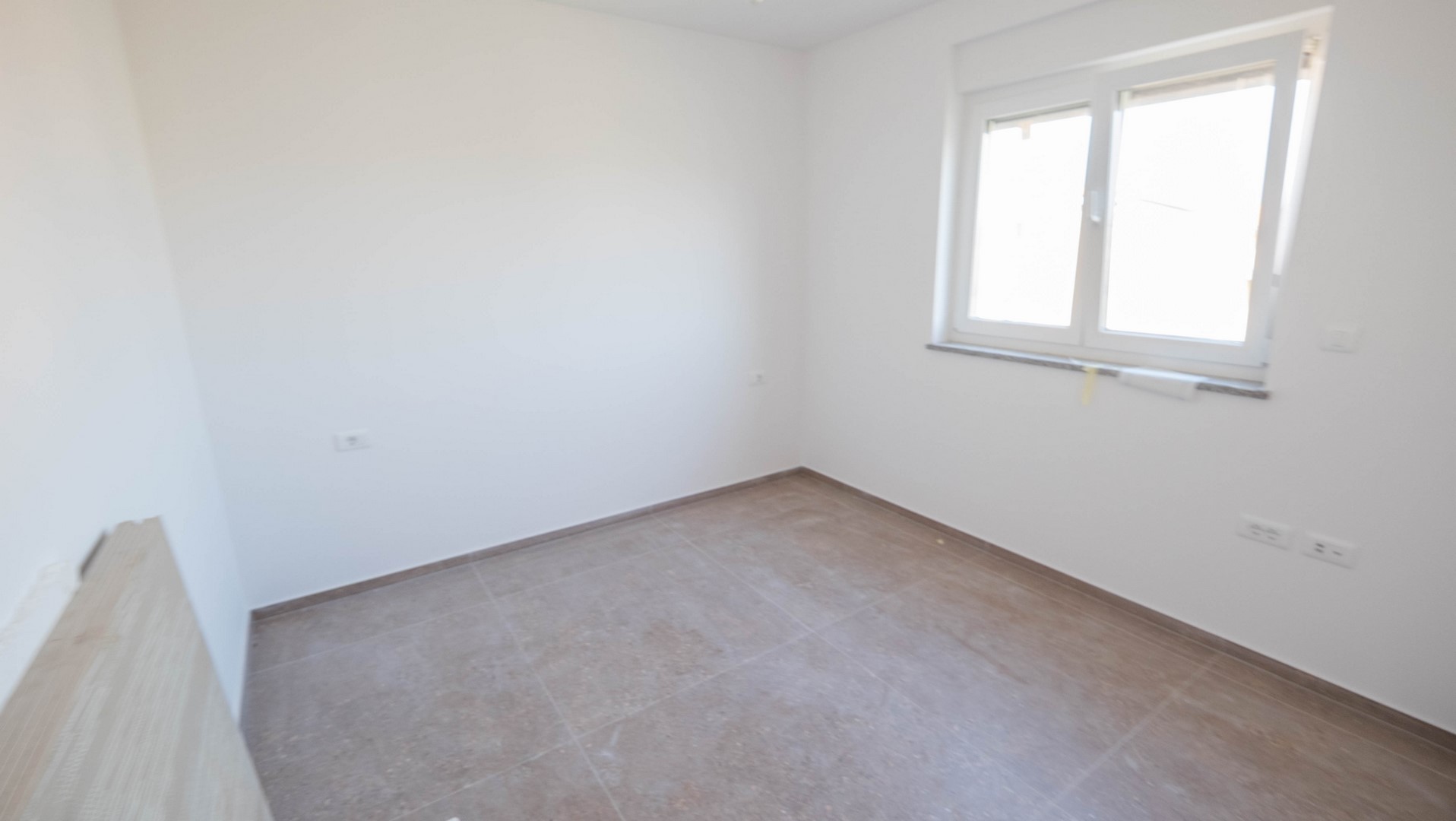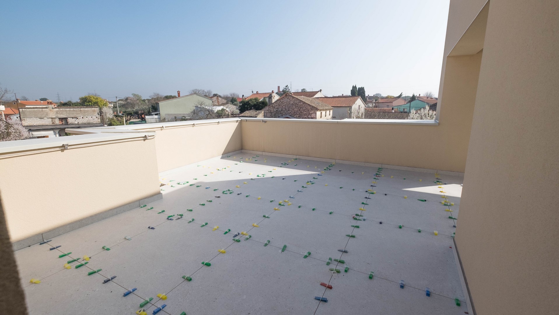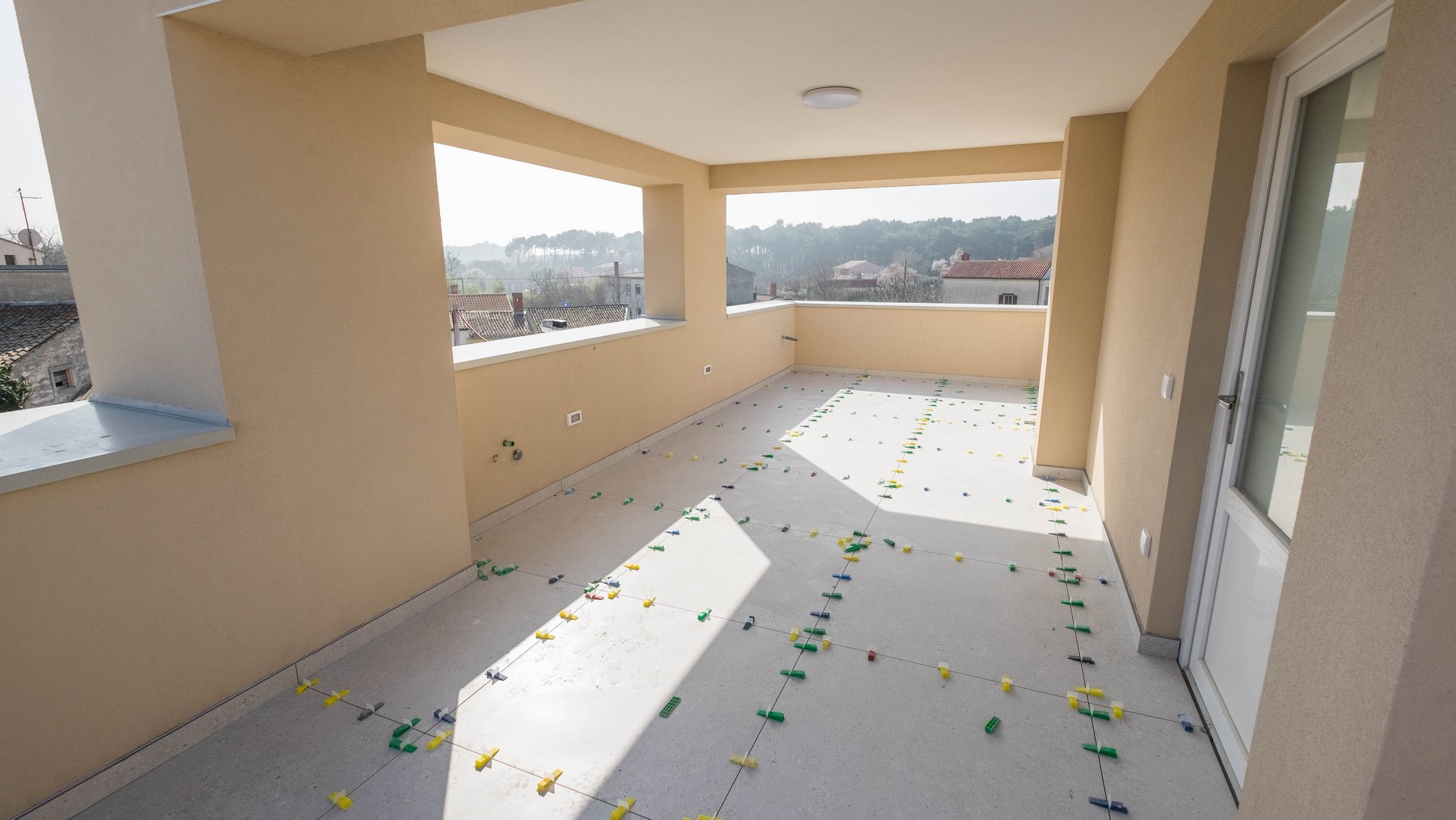 Pula - Valdebek, luxuriöse Zweizimmerwohnung im Bau mit einer Gesamtfläche von 80 m² im zweiten Stock. Die Wohnung besteht aus einem Eingangsbereich, zwei Schlafzimmern, einem Wohnzimmer mit Küche und Essbereich sowie einer Loggia. Zur Wohnung gehören eine Dachterrasse von 48 m² und ein Außenstellplatz.