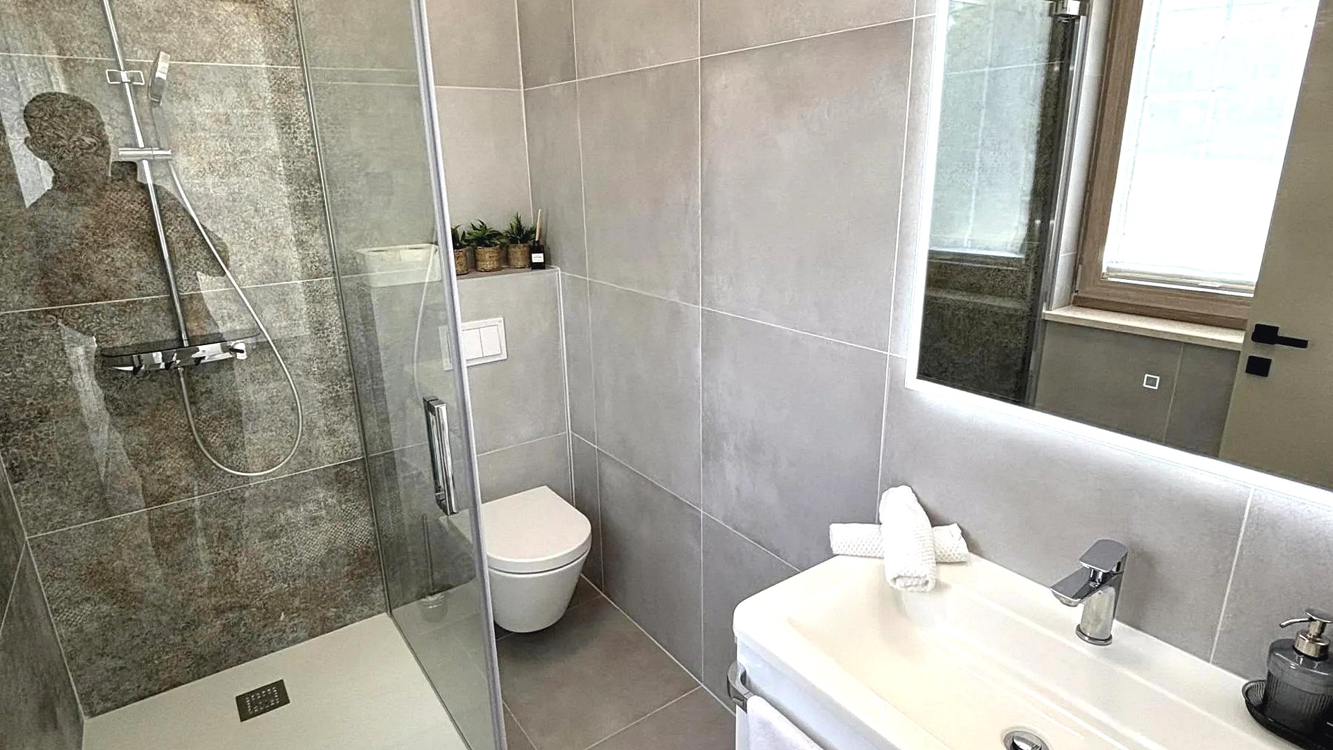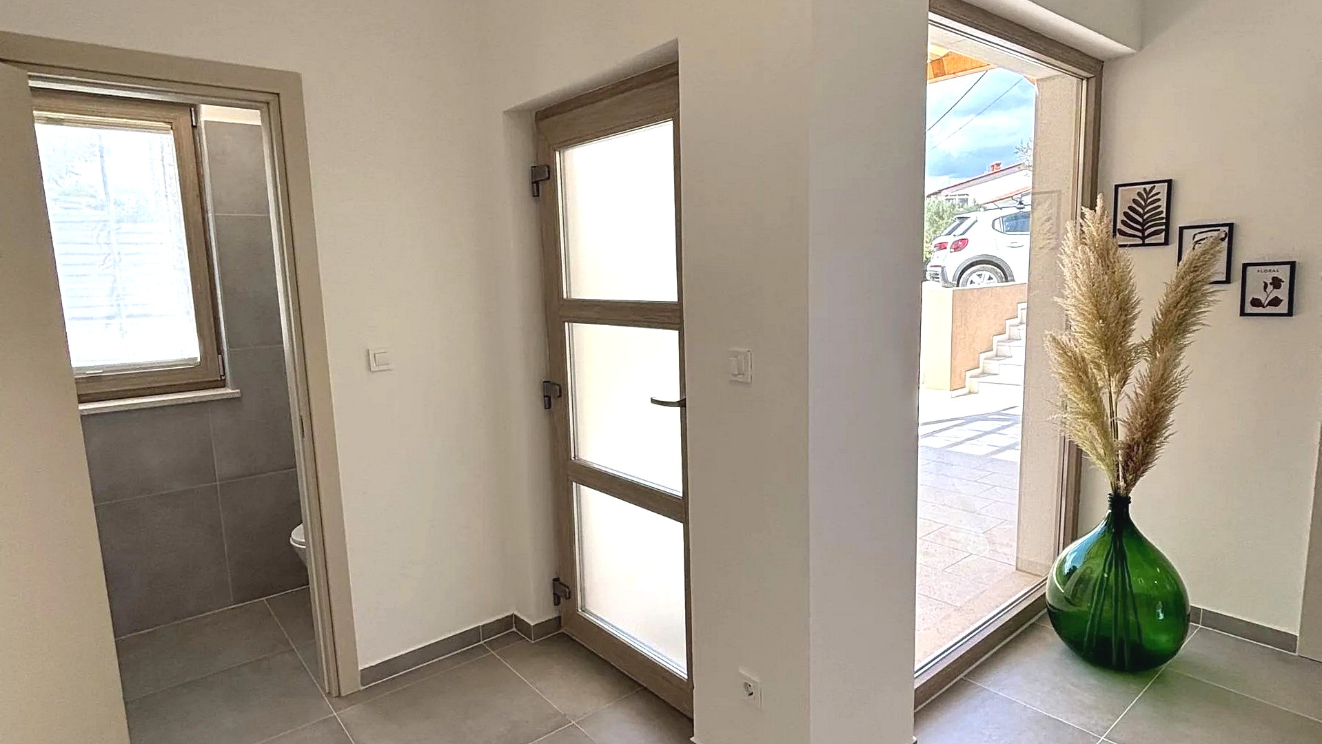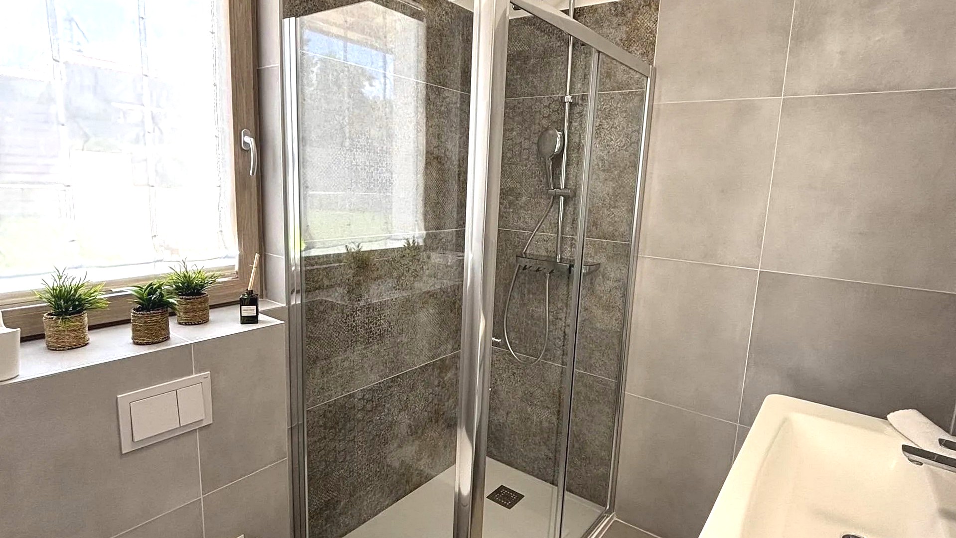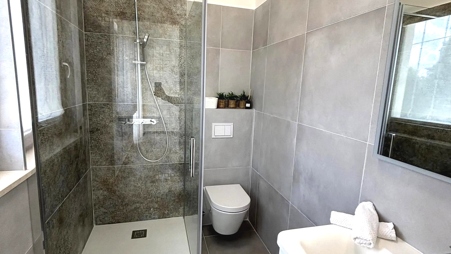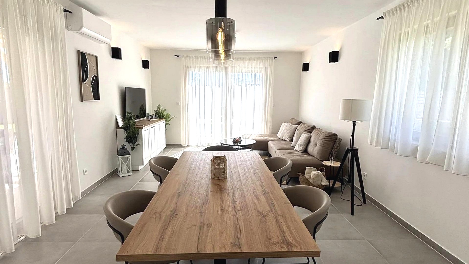 Im Erdgeschoss befinden sich ein Eingangsbereich, ein WC, ein Abstellraum mit Waschbereich, ein Schlafzimmer mit eigenem Bad sowie ein offener Raum mit Küche, Esszimmer und Wohnzimmer. Vom Wohnzimmer aus führen zwei Schiebetüren — eine direkt zum Pool und die andere auf die großzügige überdachte Sommerküche-Terrasse.