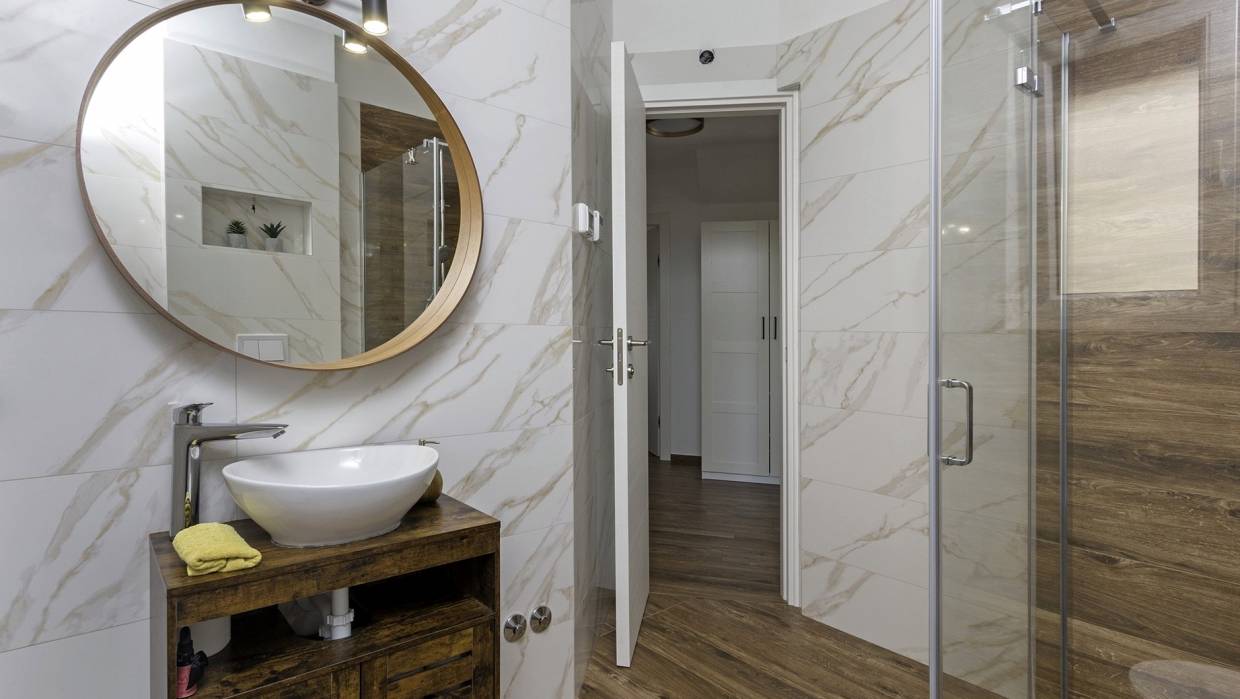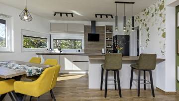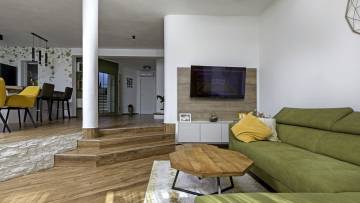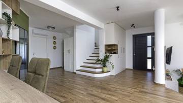 Samostoječa družinska hiša se nahaja na parceli velikosti 995 m², v mirnem kraju le 19 km od Pulja in 3 km od morja, obdana s čudovito naravo. Hiša obsega dve etaži. V pritličju se nahaja spalnica z lastno kopalnico, dnevna soba z izhodom na pokrito teraso, jedilnica ter kuhinja odprtega koncepta. Ob kuhinji sta shramba in pralnica. V nadstropju so tri spalnice, dve kopalnici ter velika elegantna terasa s stekleno ograjo, ki ponuja čudovit razgled na okolico. Na parceli stojita tudi dve legalizirani pomožni stavbi, na njunem mestu pa je mogoče zgraditi dodatno hišo. Po celotni hiši je vgrajeno talno gretje preko toplotne črpalke Fujitsu (z možnostjo priklopa ogrevanja bazena). Pri gradnji so bili uporabljeni visoko kakovostni materiali. Za hlajenje sta nameščeni dve inverterski klimi. Hiša ima tudi dimnik, kar omogoča namestitev kamina ali peči. Pohištvo je izdelano po meri. Moderna kuhinja je znamke Danküchen, večina aparatov pa je visokokakovostnih (Bosch, Miele). Arhitektura hiše je moderna, s ravno streho in privlačnim videzom. Prodaja se popolnoma opremljena. Skupna površina hiše: 160 m² – pritličje + nadstropje. Pritličje (90 m²): kuhinja z jedilnico 24,47 m², dnevna soba 16,30 m², spalnica 9,40 m², kopalnica 5,19 m², pralnica in shramba 13 m², pokrita terasa 6 m², hodnik in predprostor 10 m². Lesene stopnice vodijo v nadstropje (70 m²), ki ga sestavljajo: hodnik 11,61 m², glavna spalnica z garderobo (14,27 m²) in kopalnico (8,25 m²), dve otroški sobi (vsaka 10,36 m²), skupna kopalnica 6,42 m². Iz sob je izhod na 20 m² veliko teraso, delno pokrito, s prekrasnim pogledom na naravo. Veliko dvorišče velikosti 995 m² nudi dovolj prostora za bazen, vrt, otroško igrišče ali druge vsebine.