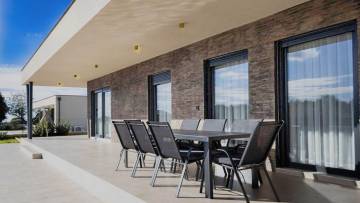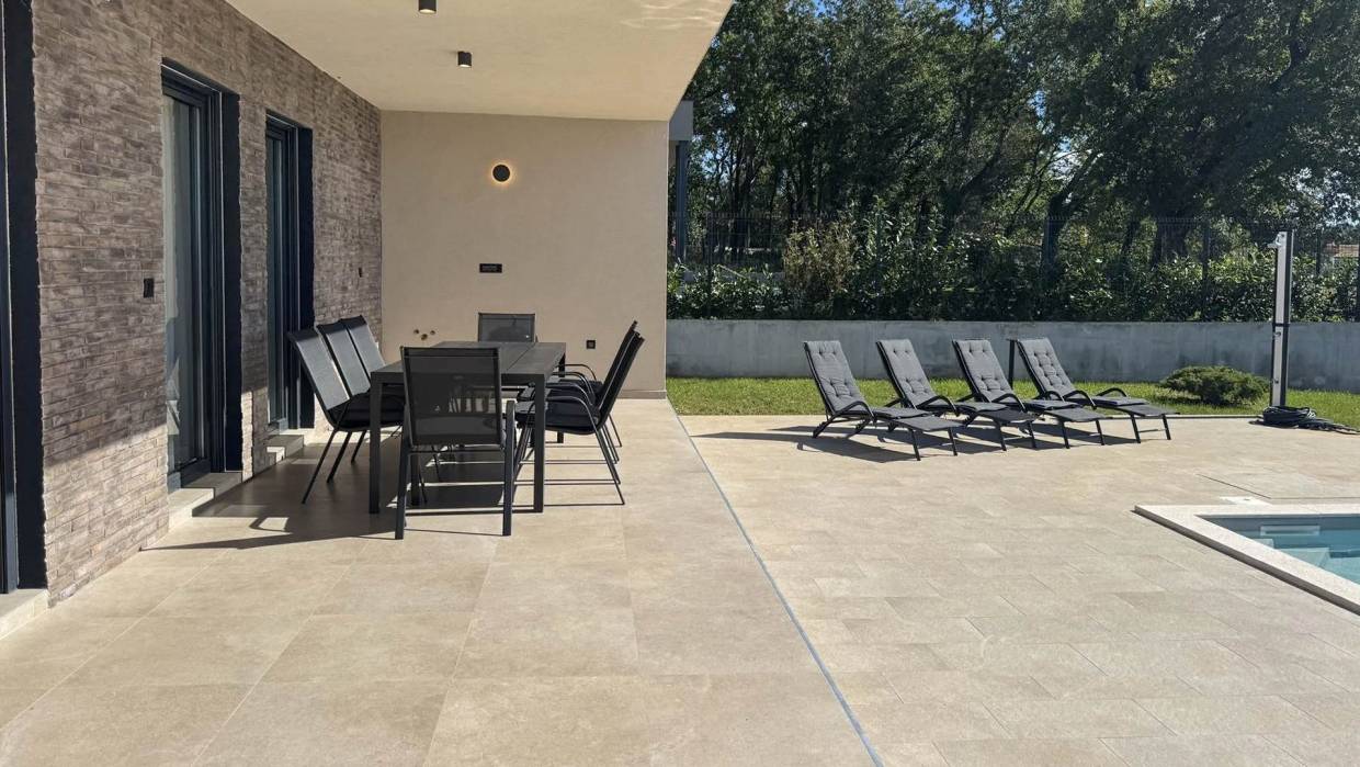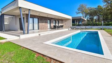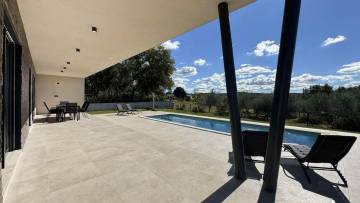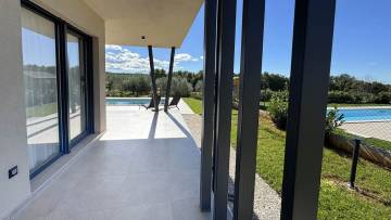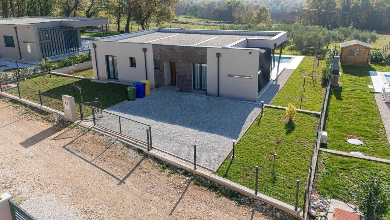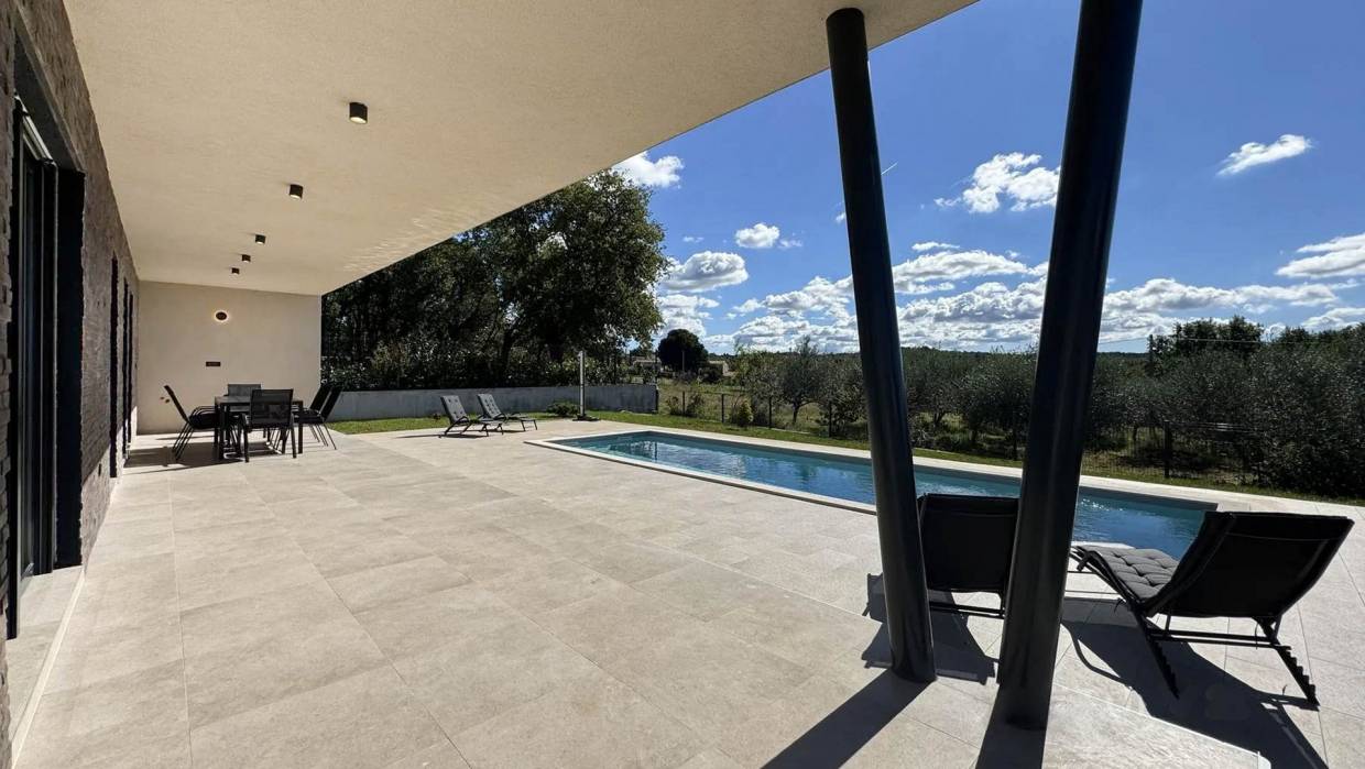 Modern single-storey house with swimming pool and two bedrooms, garden and parking spaces. This property is located in a quiet Istrian village and is ideal as a holiday home or for year-round living. The house has a net living area of ​​98 m² and is located on a plot of 673 m². It consists of an entrance hall, a guest bathroom and one bedroom, which leads into a spacious open-plan living room, dining room and kitchen. The living room opens on two sides to a covered terrace that leads to a sun terrace and a swimming pool with shower and offers beautiful views of the olive grove. From the kitchen there is access to the sleeping area, which includes a second bedroom and another bathroom. Heating and cooling are provided by three indoor air conditioning units installed in all rooms, while an artificial fireplace in the living room adds warmth and atmosphere during the winter months. The house is sold fully furnished and equipped with brand new furniture and appliances, including: kitchen with island, dishwasher, oven, microwave, refrigerator, induction hob with built-in extractor hood, 160 cm TV in the living room, and 82 cm TV in each bedroom, 3 air conditioning units for heating and cooling, artificial fireplace in the living room for additional comfort. The landscaped garden offers ample parking for several vehicles and a pleasant outdoor space for relaxing by the 30 m² (3x10 m) swimming pool and sunny terraces. For more information and to arrange a tour, please contact us.