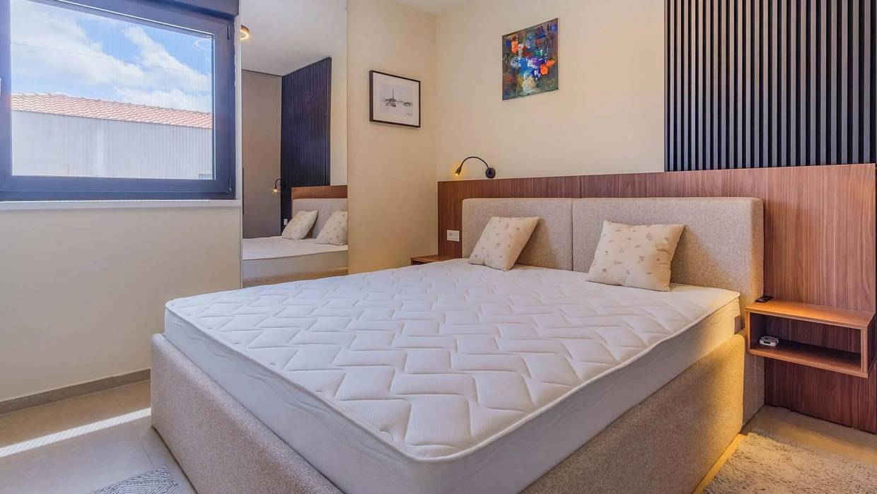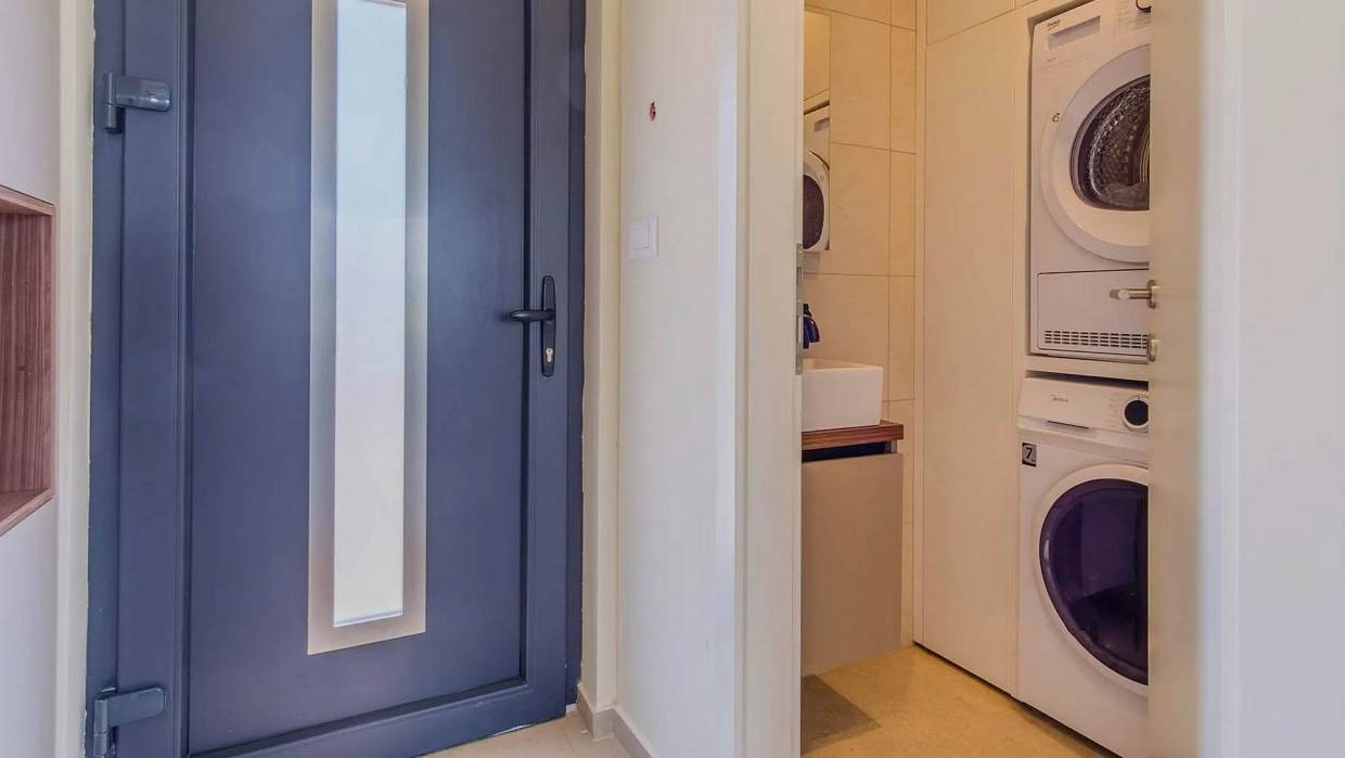 A modern single-storey house for sale with a pool located in a beautiful and a peaceful village. The house consists of an entrance hall, guest toilet with laundry, 2 bedrooms with a shared bathroom, master bedroom with en suite bathroom, kitchen, spacious living room with dining room with access to a covered terrace with an outdoor kitchen, sun terrace and swimming pool. The house is sold fully furnished. The garden with pool offers nice space for chilling and enjoying.