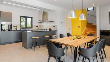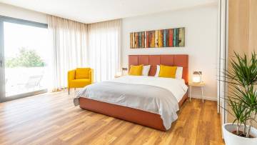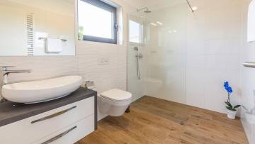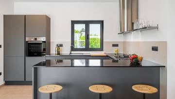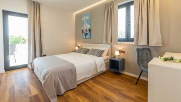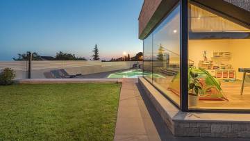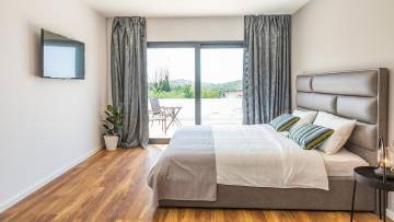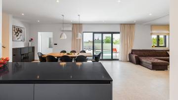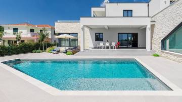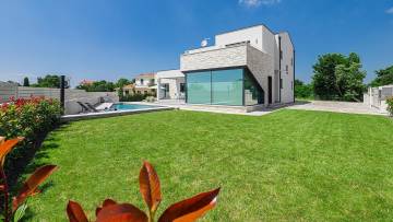 Beautiful modern villa with pool just 2 km from the center of Porec. The ground floor consists of entrance area, living room, kitchen with dining room, bedroom, bathroom, boiler room and storage. Upstairs there are three bedrooms and two bathrooms as well as two large terraces with approx. 60 qm. The villa has large glass walls and always has a lot of natural light. The whole villa has gas underfloor heating and all rooms are air-conditioned. It is sold with all furniture and appliances. The ground floor offers panoramic view of the city and the sea.