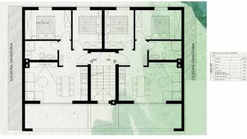 The apartment is located on the first floor of the building and covers a total of 60 m². It consists of an entrance hall that leads to an open space where the kitchen, dining room and living room are connected with an exit to the terrace. In addition, the apartment includes two bedrooms and a bathroom. The price includes a parking space and a storage room located on the ground floor of the building.