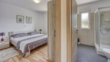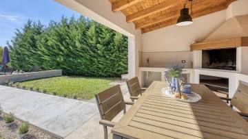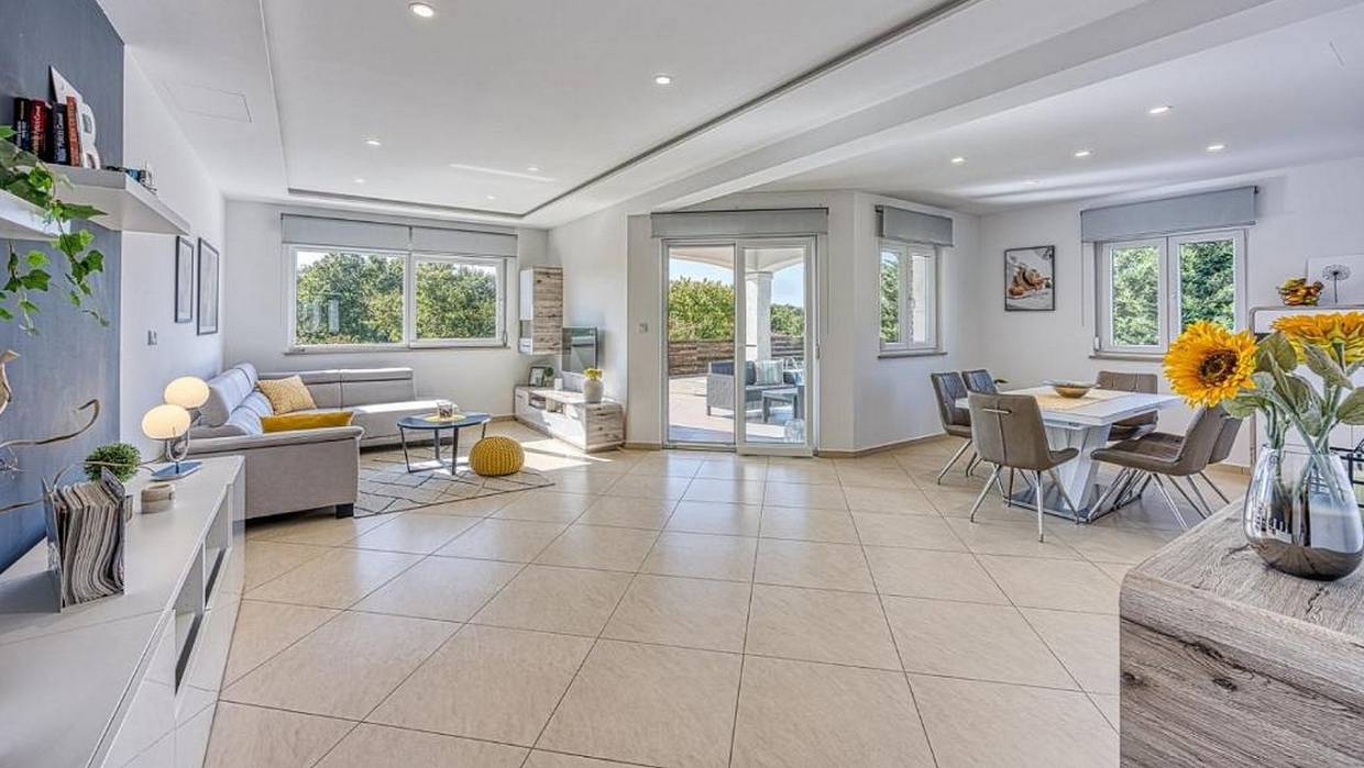 A beautiful single-storey house with a swimming pool in Tinjan is for sale, with a total area of ​​151 m2. It consists of a kitchen, dining room and a spacious living room with an open space concept. The house has 3 bedrooms, 2 bathrooms, a storage room and a dressing room. The living room has an exit to a covered terrace of 150 m2. The house is located on a larger plot of 825 m2 and has a 4x7 m swimming pool, a covered gazebo with a summer kitchen and barbecue and several parking spaces. The property has a 25 m3 cistern, which is in operation and can be used for irrigation during the summer period. The garden is horticulturally decorated and regularly maintained, is completely fenced and provides enough privacy. Heating and cooling are provided by 2 air conditioners, central heating installations have been installed and there is the possibility of heating with solid fuels since the house has a chimney. It is located in a beautiful setting, 15 km from the attractive Poreč.