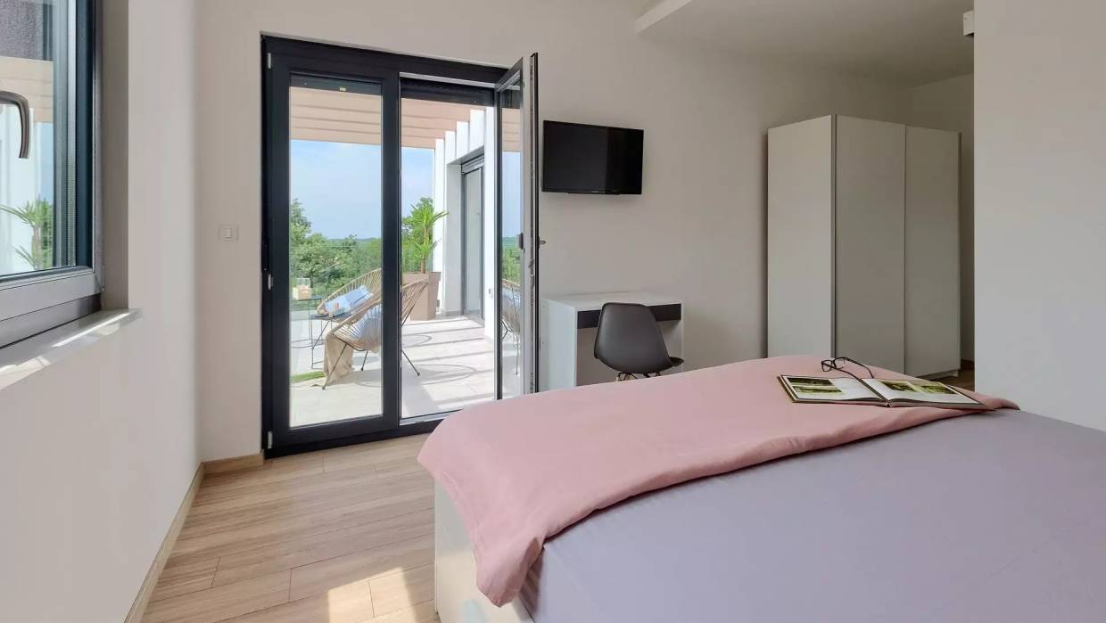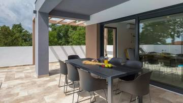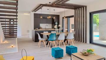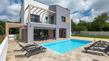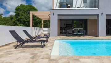 Schönes Haus mit drei Schlafzimmern und 3 Bädern und einer Toilette, bestehend aus Erdgeschoss und Obergeschoss mit einer Gesamtwohnfläche von 160 m2. Das Erdgeschoss besteht aus einem geräumigen Wohnzimmer mit Zugang zur Poolterrasse, einem Esszimmer und einer voll ausgestatteten Küche sowie einer Gästetoilette und einem Abstellraum. Der erste Stock besteht aus drei Schlafzimmern, jedes mit eigenem Bad. Zwei Schlafzimmer haben Zugang zu einem Balkon mit einem schönen Blick auf das umliegende Grün und die Natur und in jedem Schlafzimmer sowie im Wohnzimmer gibt es Klimaanlagen. Zusätzlich zur Klimaanlage gibt es im Wohnzimmer einen schönen Holzkamin im Innenbereich. Der Garten hat eine Gesamtfläche von 600 m2 und ist vollständig eingezäunt und angelegt. Es gibt Parkplätze für zwei Autos, eine schöne überdachte Sommerküche mit Blick auf den Pool und den Garten und einen Pool von 32 m2.