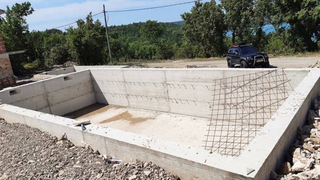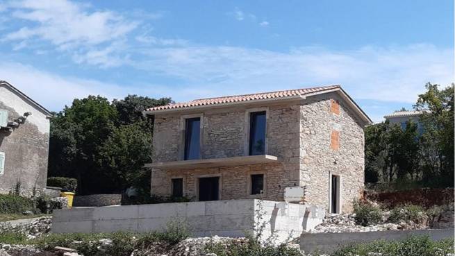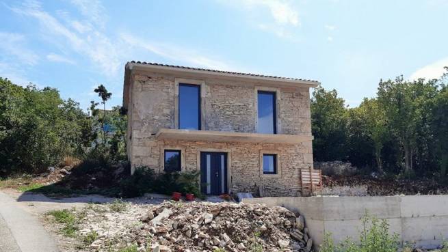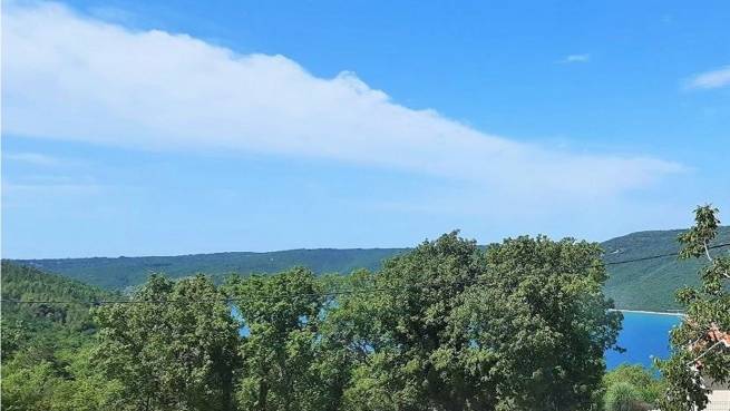 Labin surroundings, newly built house with sea view. The house consists of a ground floor and a first floor. On the ground floor there is a kitchen with a dining room, a living room with an exit to the terrace, a toilet and a storage room. Stairs lead to the upper floor, which consists of two bedrooms, a bathroom and a balcony with a beautiful view of the sea.