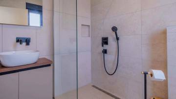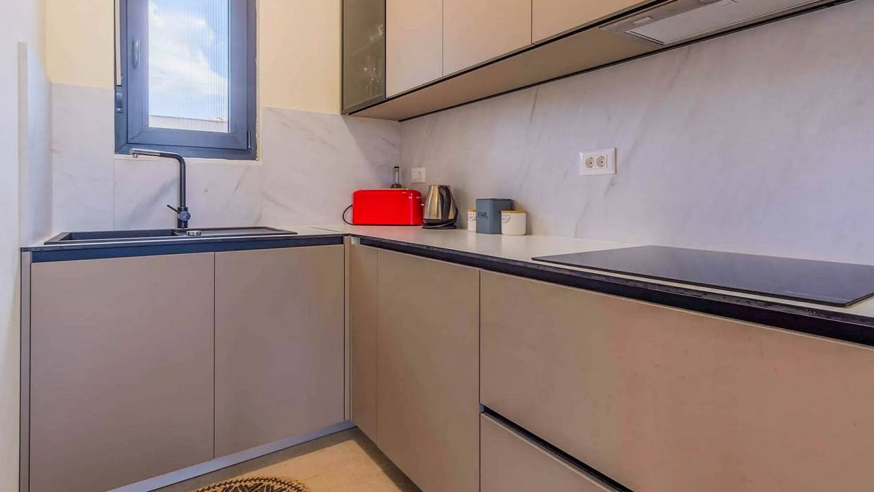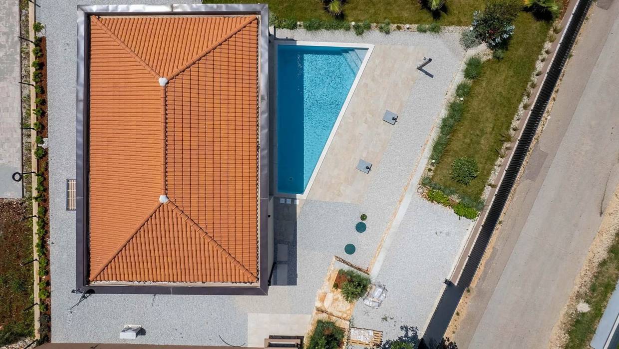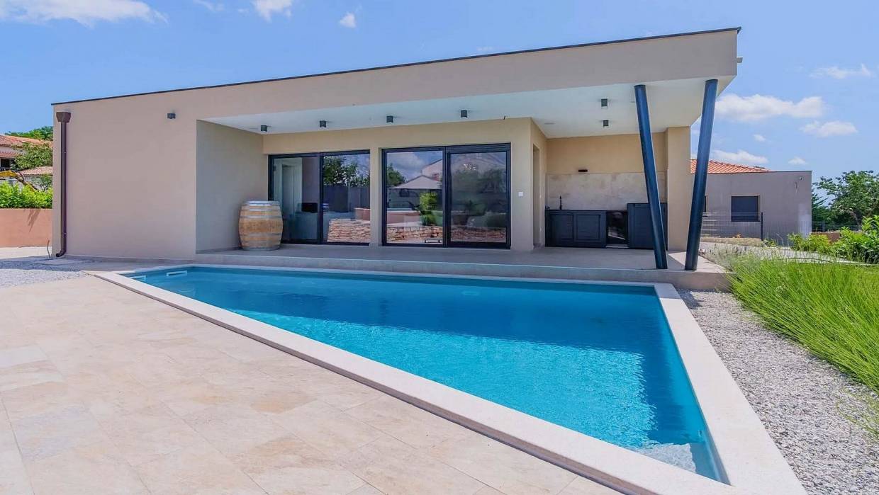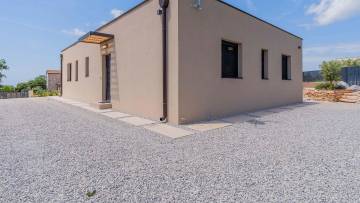 A modern single-storey house for sale with a pool located in a beautiful and a peaceful village. The house consists of an entrance hall, guest toilet with laundry, 2 bedrooms with a shared bathroom, master bedroom with en suite bathroom, kitchen, spacious living room with dining room with access to a covered terrace with an outdoor kitchen, sun terrace and swimming pool. The house is sold fully furnished. The garden with pool offers nice space for chilling and enjoying.