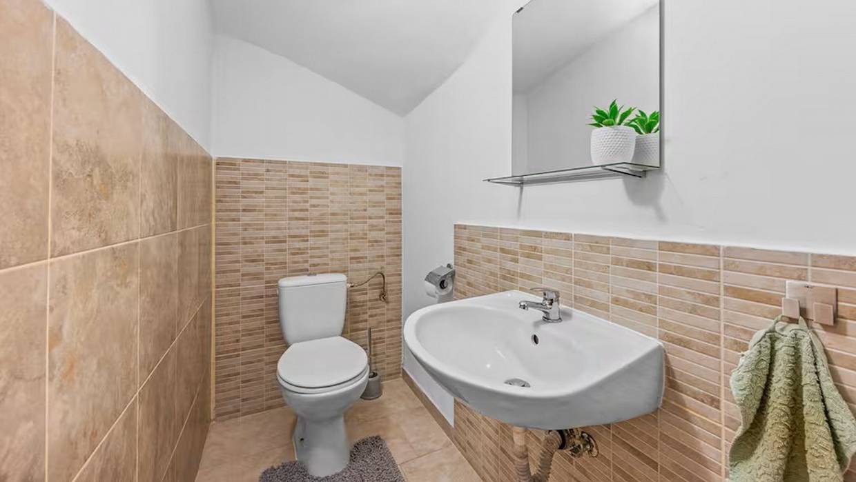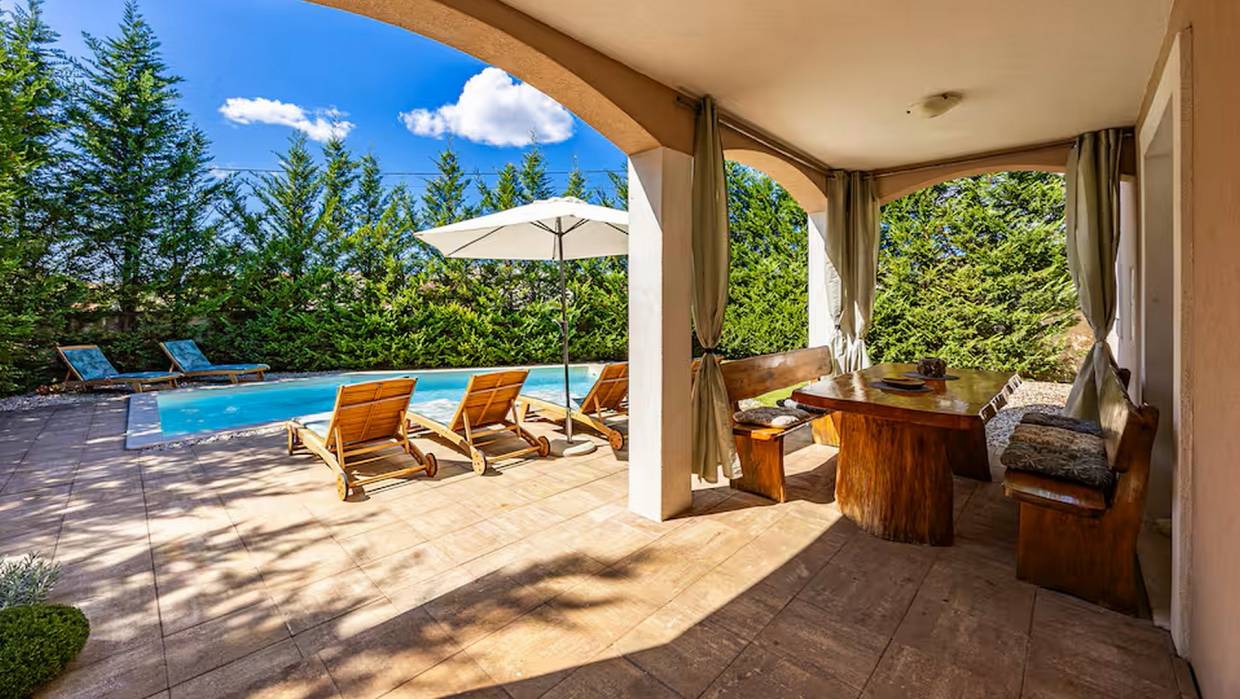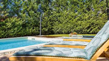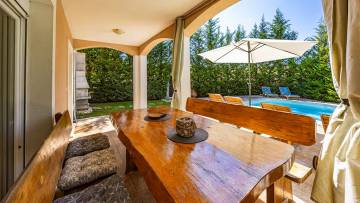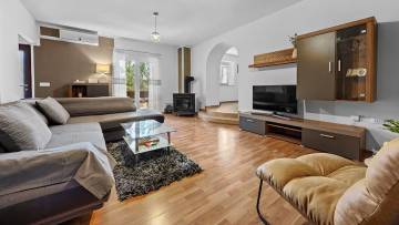 House surrounded by a pool and beautiful landscape with forest. The interior extends through the ground floor and the first floor, which can be reached via an internal staircase. The surface of the house is 110 m2 and the property itself 245 m2. The house consists of a kitchen with dining area, storage area, living room and toilet on the ground floor and three bedrooms and a large bathroom on the first floor.The exterior is dominated by an outdoor pool. It's sold fully furnished.