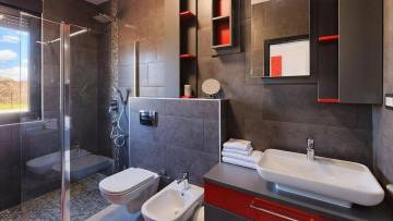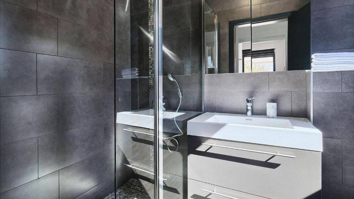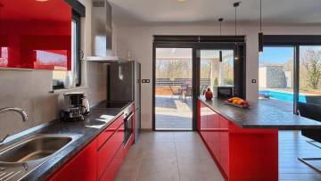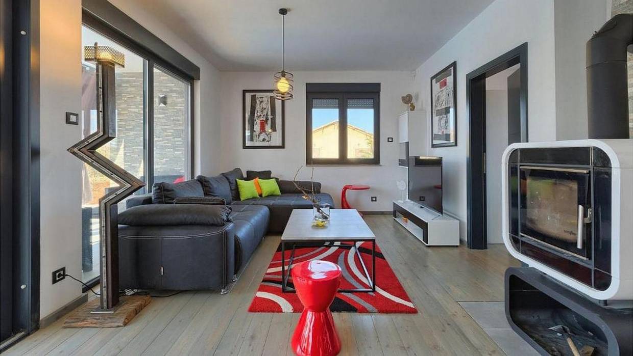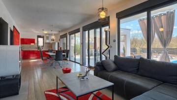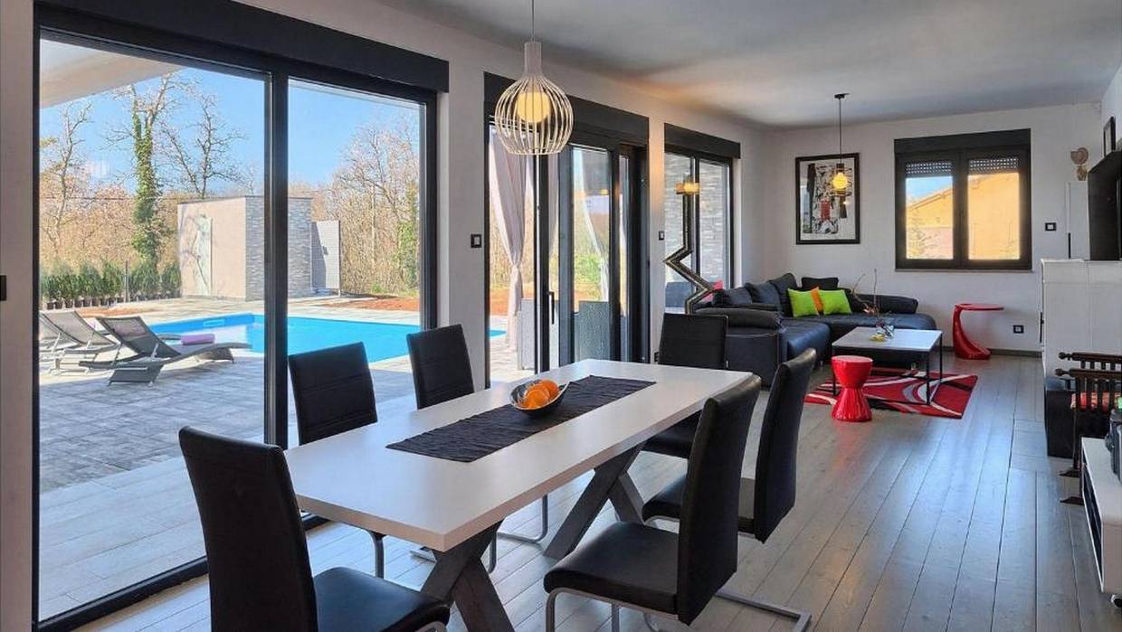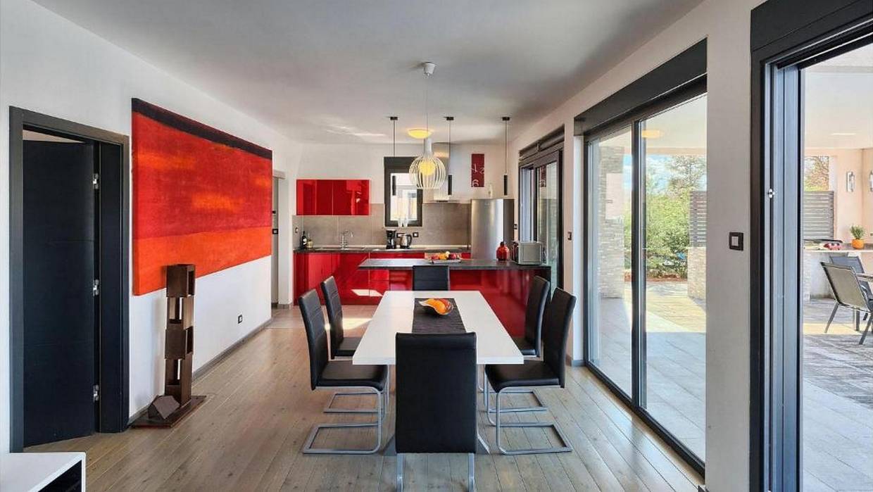 Electric shutters are located on large glass walls while the summer kitchen with barbecue and pool gives the house a complete atmosphere for enjoying the garden and yard.