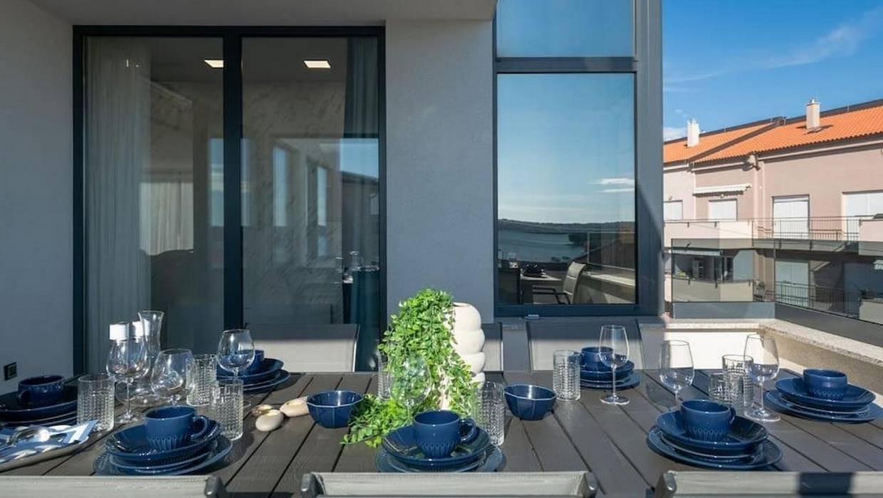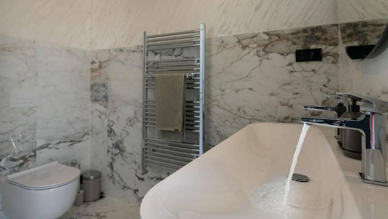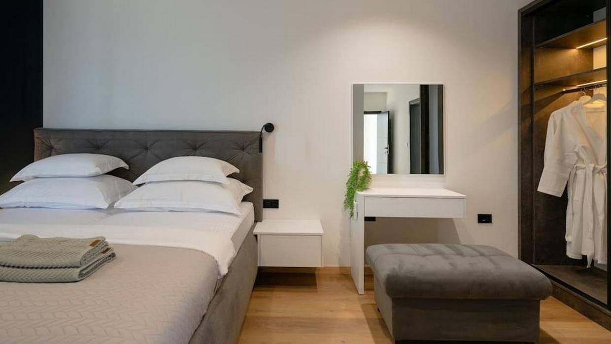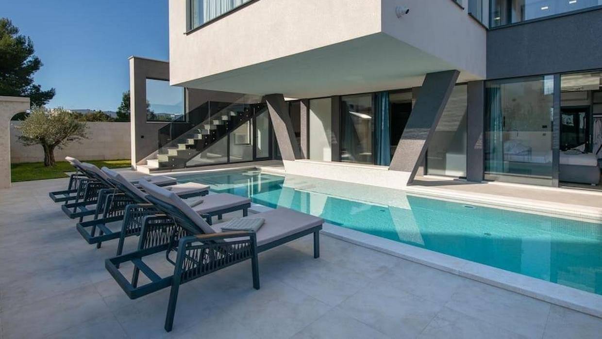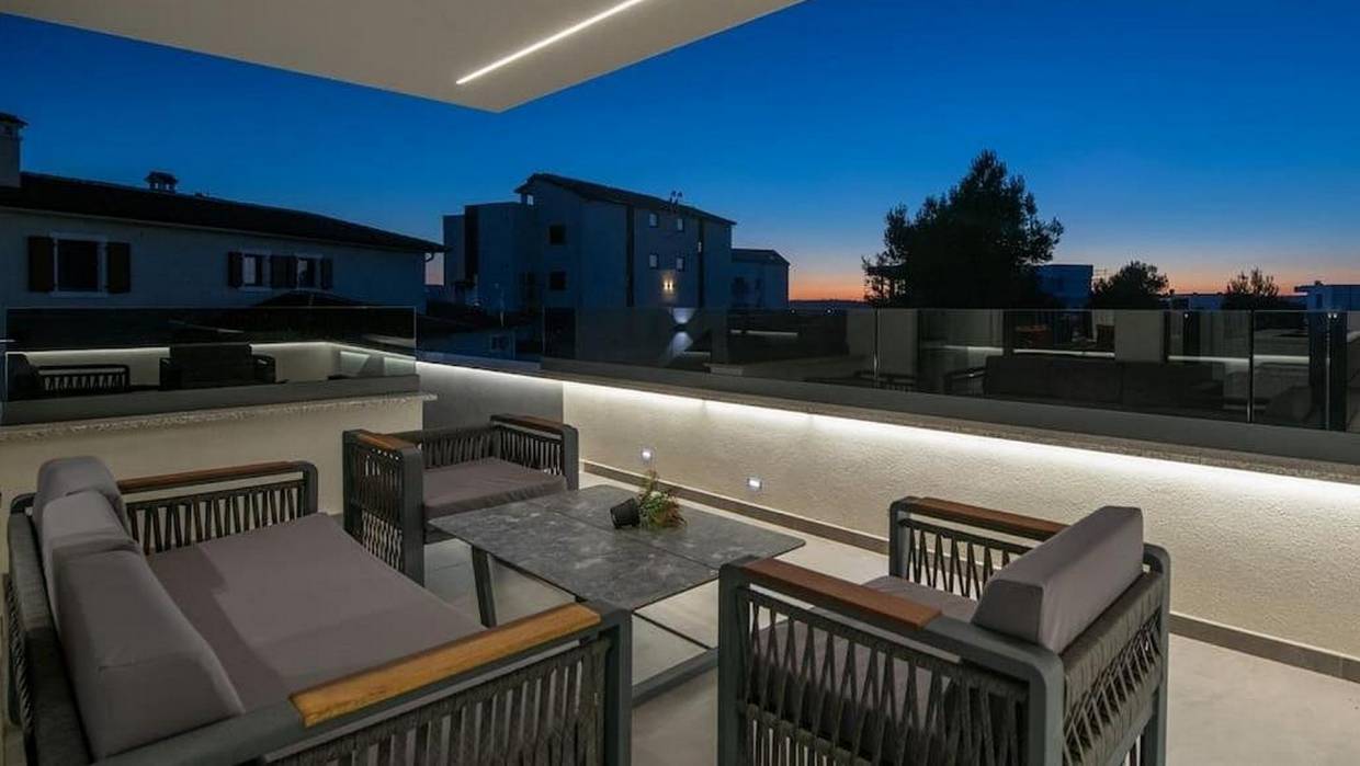 The house is fully furnished and modernly equipped — it has a heat pump system for heating and cooling, air conditioning in every room, custom-made furniture, stone floors, and double glass railings on the staircase and terraces. There are four parking spaces in the garden, two of which have electric vehicle chargers.