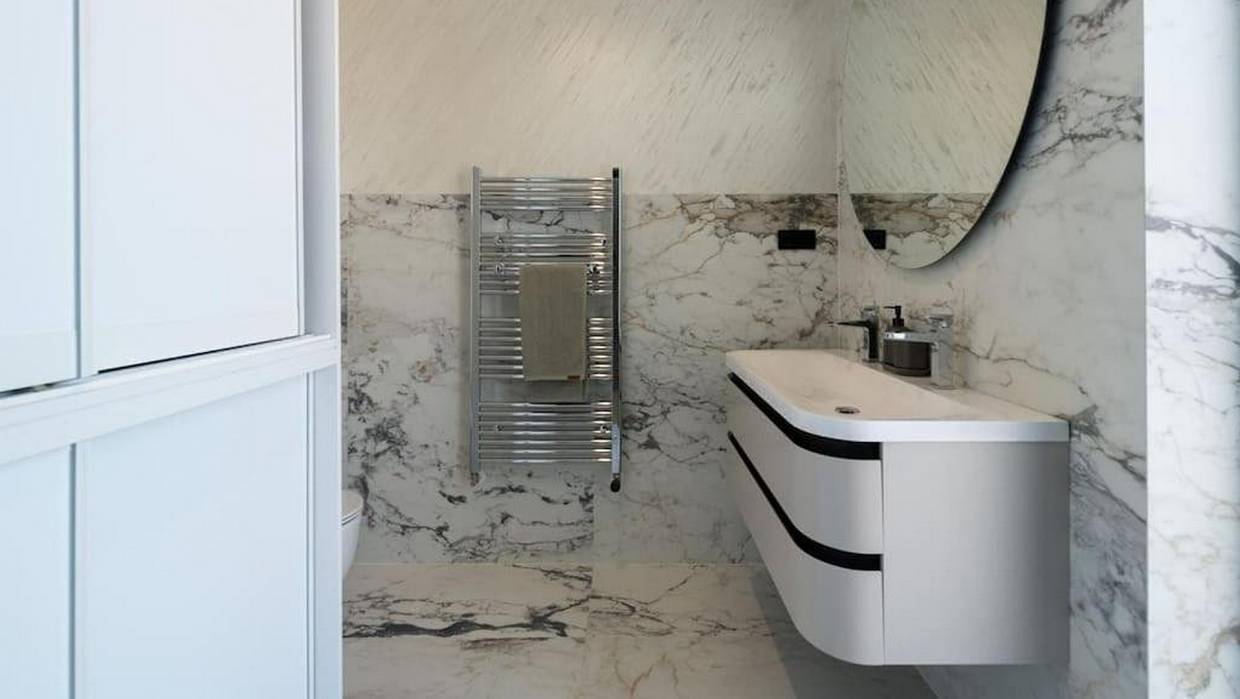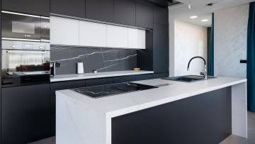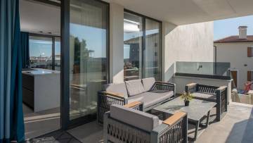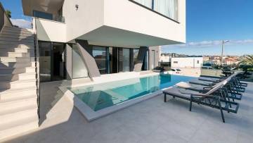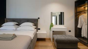On the top floor there is an additional bedroom with its own bathroom, as well as a spacious wellness area and a roof terrace with a stunning sea view.