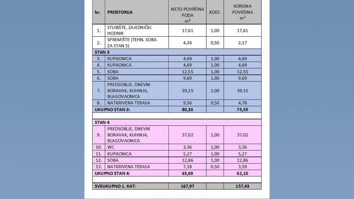 Luksuzni dvosoban stan (STAN 3) površine 75.55 m2 na prvom katu. Stan je opremljen podnim grijanjem u kupaonici, kao i klima uređajem sa split sustavom u drugim prostorijama. Stan dolazi s jednim parkirnim mjestom.
