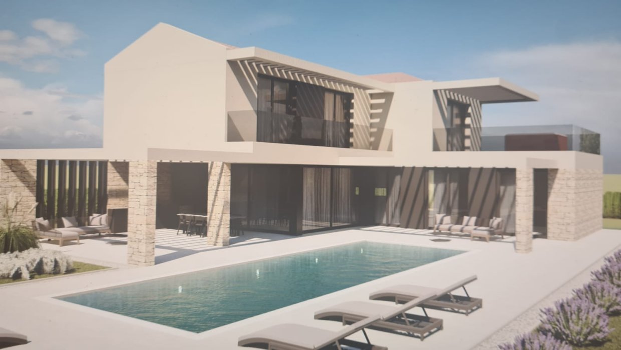Višnjan okolica, građevinsko zemljište pravilnog oblika, površine 1.085 m2 s idejnim projektom. Plaćen priključak vode i struje. Panoramski pogled na more.