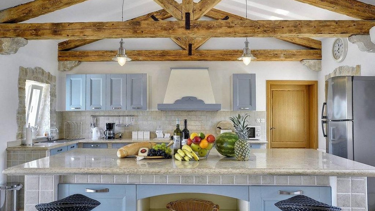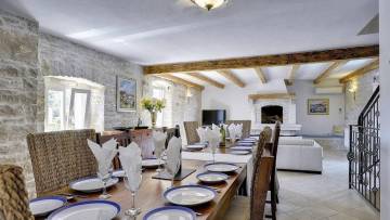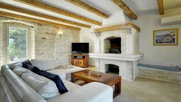 Unutarnje stepenice vode na prvi kat, gdje se nalazi prostrana kuhinja s otokom, blagovaonica te ugodan dnevni boravak s kaminom. Iz dnevnog boravka izlazi se na dvije terase, idealne za opuštanje i uživanje na otvorenom.