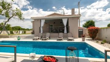 Kuća se sastoji od ulaznog prostora, dnevnog boravka, kuhinje i blagovaone kao open-space, tri spavaće sobe s vlastitim kupaonama te toaleta za goste. Dnevni prostor ima izlaz na natkrivenu terasu koja vodi u uređen vrt u kojem se nalazi bazen s plažom za sunčanje.
