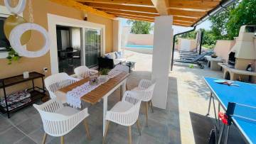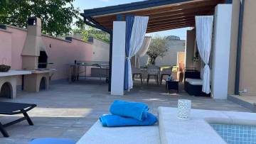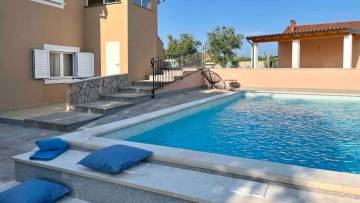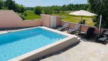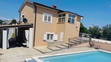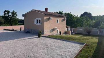 Prekrasna kuća u blizini Barbana na 200 m² stambenog prostora na uređenoj parceli od 850 m². Kuća se sastoji od prizemlja, prvog kata koji se uređeni kao dvije odvojene stambene jedinice. To nekretninu čini idealnom za ugodan obiteljski život s dodatnim prostorom za goste, korištenje za više generacija ili kao investiciju za najam za odmor u Istri. Prizemlje je dizajnirano kao open space koji povezuje ulazni prostor, kuhinju i dnevni boravak, zajedno sa spavaćom sobom i kupaonicom. Dnevni boravak se nastavlja na natkrivenu terasu okrenutu prema zelenilu sa kutom za opuštanje i roštilj. Uz terasu je bazen koji s okolnim travnjakom nudi puno prostora za sunčanje i igru. Na katu je druga jedinica koja nudi prostrani dnevni boravak s kuhinjom, kupaonicom i dvije spavaće sobe. Raspored je funkcionalan i privlačan, a cjelokupni dojam je doma pogodnog za cjelogodišnju upotrebu uz klima uređaje po cijelom objektu. Vanjski prostor je prostran i lako dostupan, s parkingom za nekoliko automobila, uključujući dva natkrivena mjesta. Lokacija pruža privatnost i mir, a istovremeno vas drži blizu svakodnevnih sadržaja i autentičnog istarskog načina života koji područje Barbana čini sve traženijim. Ako tražite kuću s bazenom u blizini Barbana, s velikom parcelom i dvije neovisne jedinice, ova nekretnina je izvrstan izbor za život i ulaganje.