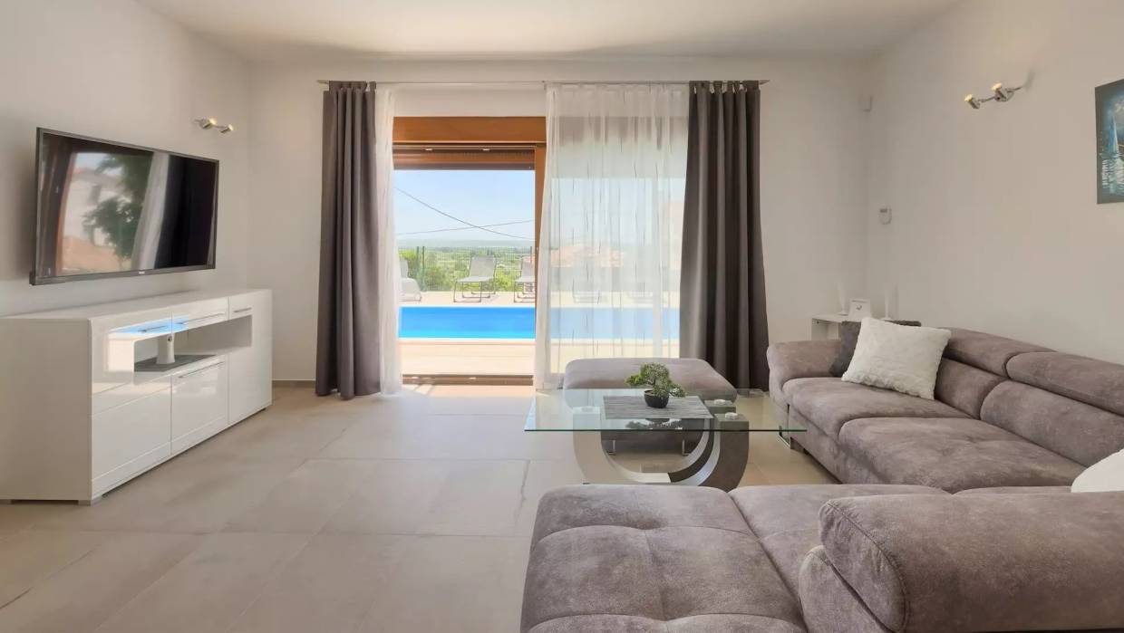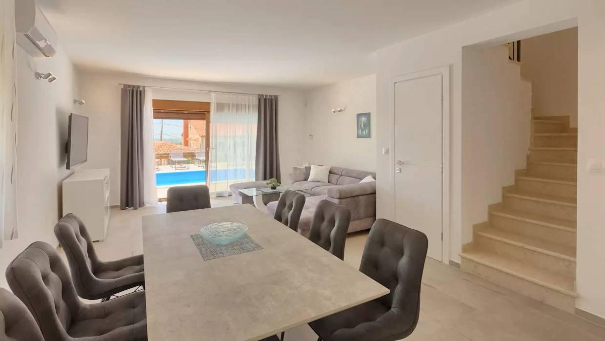 Novosagrađena kuća s bazenom u okolici Poreča. Sastoji se od otvorenog dnevnog boravka s kuhinjom i blagovaonicom, dvije spavaće sobe i još jedne sobe na trećoj etaži. Na trećoj etaži nalazi se i terasa s koje se pruža divan pogled na zelenilo i more. U vrtu se nalazi natkrivena terasa za uživanje u toplim danima. Ispred kuće su dva parkirna mjesta. Odlična nekretnina za iznajmljivanje! Predaja posjeda moguća od 10/2020.