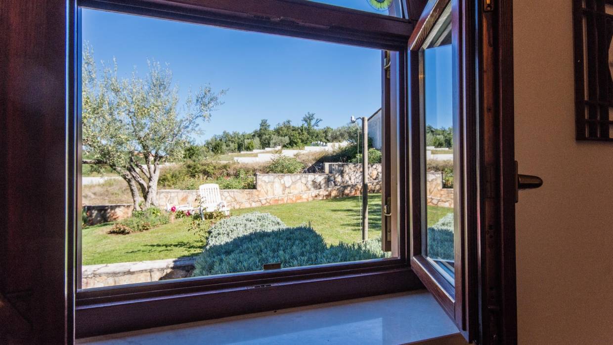 Prekrasna kuća na odličnoj lokaciji s pogledom na more na prodaju u okolici Poreča (8 km). Kuća se nalazi u blizini svih potrebnih sadržaja. Lijepa prizemnica površine 100 m2 s pogledom na more se sastoji od open space dnevnog boravka i blagovaone, kuhinje, dvije spavaće sobe, hodnika, kupatila, toaleta, 2 terase i garaže. Grijanje je izvedeno s kaminom i s 3 inverter klima uređaja. Kuća se prodaje potpuno opremljena i namještena. Kuća ima 2 parkirna mjesta. Moguće je napraviti bazen te je također moguće konvertirati garažu u 3. spavaću sobu.