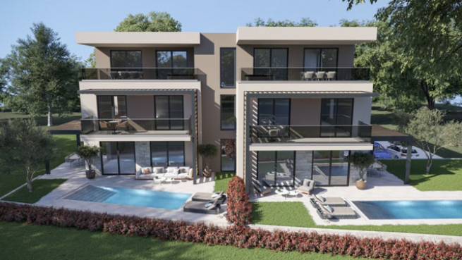 Poreč-okolica, luksuzni dvoetažni stan s bazenom i dvorištem.