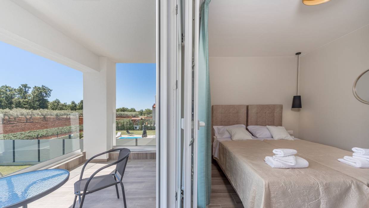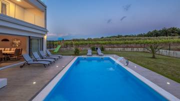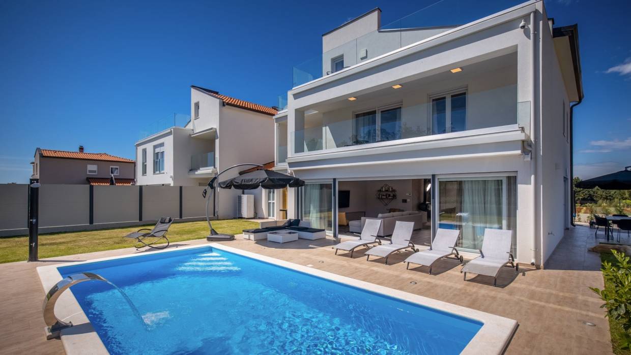 Luksuzna novoizgrađena vila udaljena od Poreča, mora i plaža samo 5 km. Stambeni prostor vile je 294 m2. Sastoji se od dnevnog boravka, kuhinje, komforne blagovaonice, šest spavaćih soba, četiri prostrane kupaonice i jednog wc-a. Vila ima i fitness prostoriju sa saunom i jacuzzijem. Interijer je opremljen vrhunskim namještajem suvremenog dizajna. Cijela vila je klimatizirana.Velike klizne stijene osiguravaju puno prirodnog svjetla. Dvorište je ograđeno što osigurava privatnost. U njemu se nalazi bazen koji se može i grijati, igralište i roštilj. Savršena nekretnina za luksuzni odmor