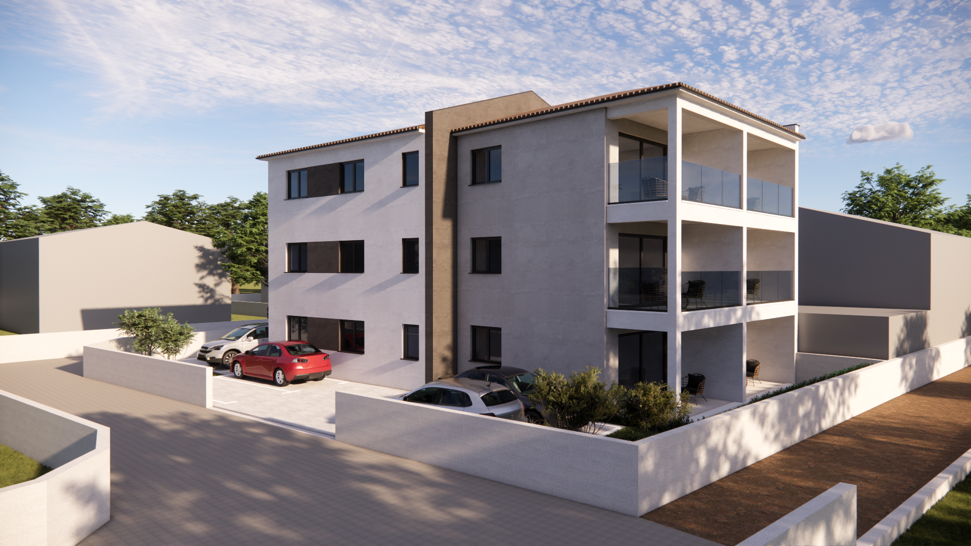 Fažana – Valbandon, dvosoban stan (E) u izgradnji, ukupne površine 62.74 m², smješten na drugom katu stambene zgrade sa šest stambenih jedinica.