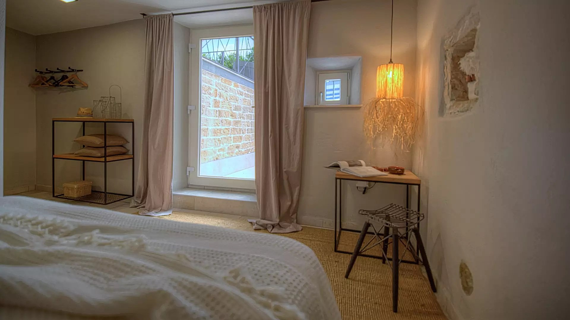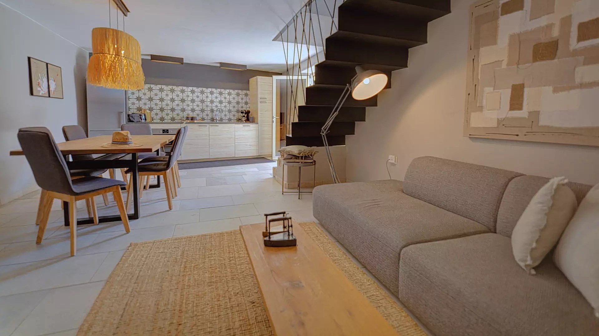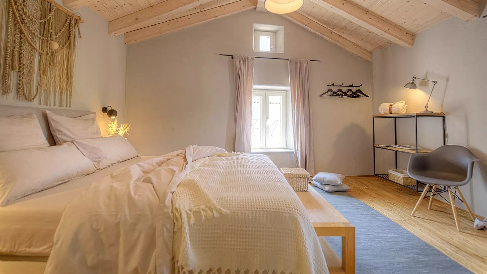Unutrašnjost sačinjavaju tri spavaće sobe u en suite varijanti s kupaonicama gdje svaka kupaonica ima podno grijanje. Dnevni boravak je prostran i udoban, baš kao i kuhinja. Interijer je koncipiran na način da se u prizemnom dijelu nalaze jedna spavaća soba s kupaonicom, kuhinja, dnevni boravak i blagovaonica, dok su na katu druge dvije spavaće sobe, svaka sa svojom terasom. Klimatizirane su sve prostorije a s obzirom da je današnja vila preuređena tradicionalna kuće, uz autohtone, originalne detalje u interijeru prevladavaju neutralne nijanse stopljene s prirodnim materijalima poput drveta i kamena. Unutrašnjost zrači luksuzom koji je upotpunjen detaljima poput luksuzne keramike, zidnih makramea ili unikatne dizajnerske rasvjete. Drvene grede u spavaćim sobama i kupaonicama daju taj posebni rustikalni šarm, koji je dodatno obogaćen prirodnim tkaninama što prevladavaju u tekstilnom dekoru. Vani je također zatvorena ostavu te dva parkirna mjesta.