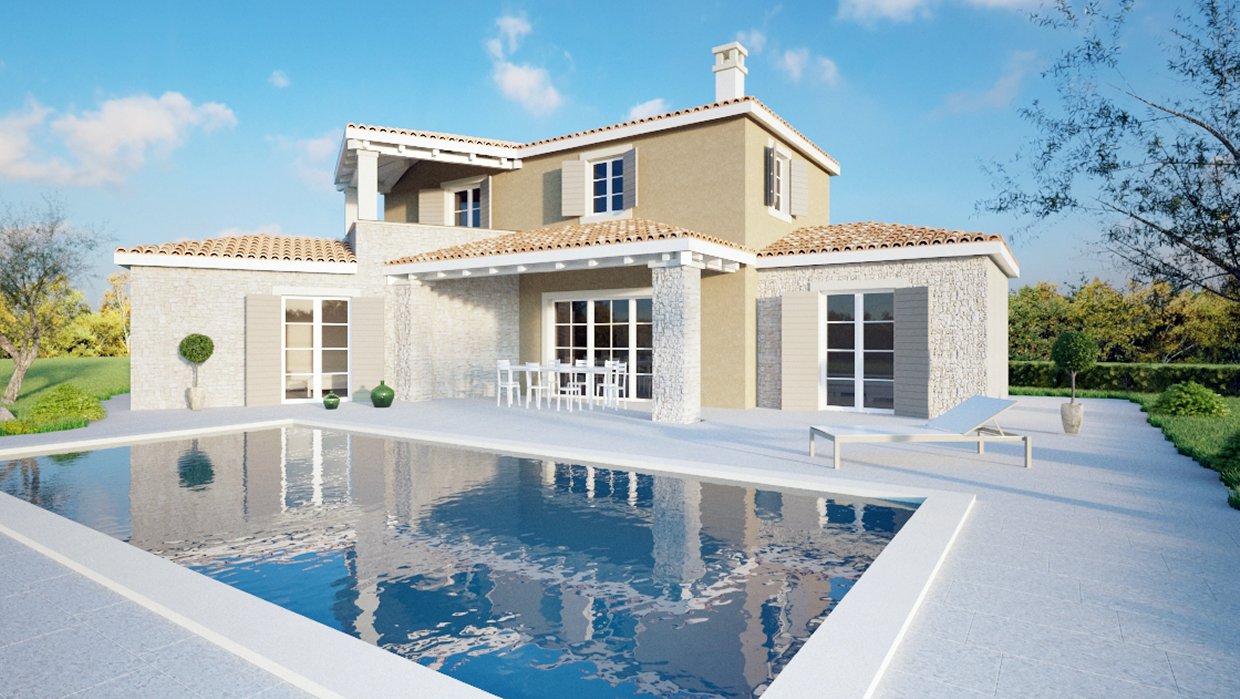 Projekt vile u okolici Tinjana. Stambena površina je 130 m² na parceli od 700 m². U prizemlju se nalaze dnevni boravak, kuhinja i blagovaona, jedna spavaća soba sa svojom kupaonom, WC za goste, kotlovnica i lijepa terasa oko bazena do koje postoji direktni pristup iz svih prostorija.Na katu se nalaze dvije spavaće sobe, svaka sa svojom kupaonom, kao i natkrivena terasa. Završetak gradnje predviđen je 2024 / Q4.
