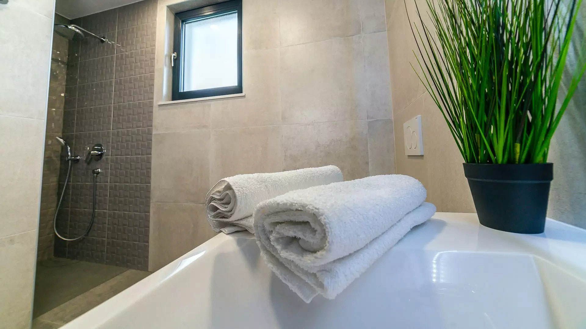 Osim uređene okućnice i travnjaka, u dvorištu se nalazi veliki bazen s hidromasažnom kadom, sunčalište te vanjski tuš.