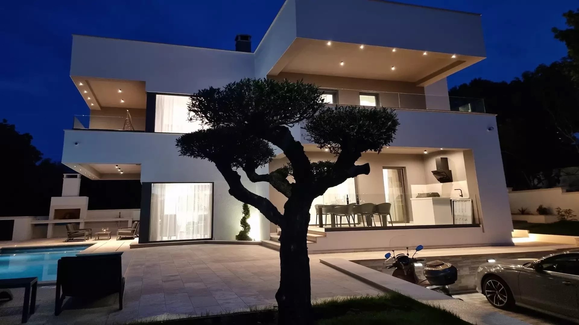 Na prodaju luksuzna vila s pogledom na more. U prizemlju vile nalazi se kuhinja s blagovaonicom i dnevnim boravkom te kupaonica. Iz blagovaonice se izlazi na terasu ispred koje se nalazi bazen površine 48 m2. Na prvom katu smještene su tri spavaće sobe sa vlastitim kupatilom i terasom s pogledom na more. Kuća je opremljena luksuznim namještajem i opremom visoke kvalitete.