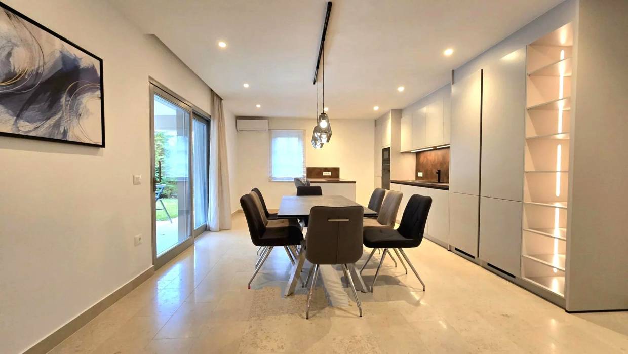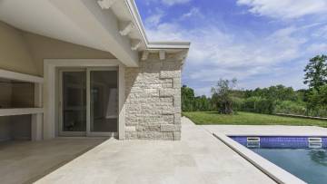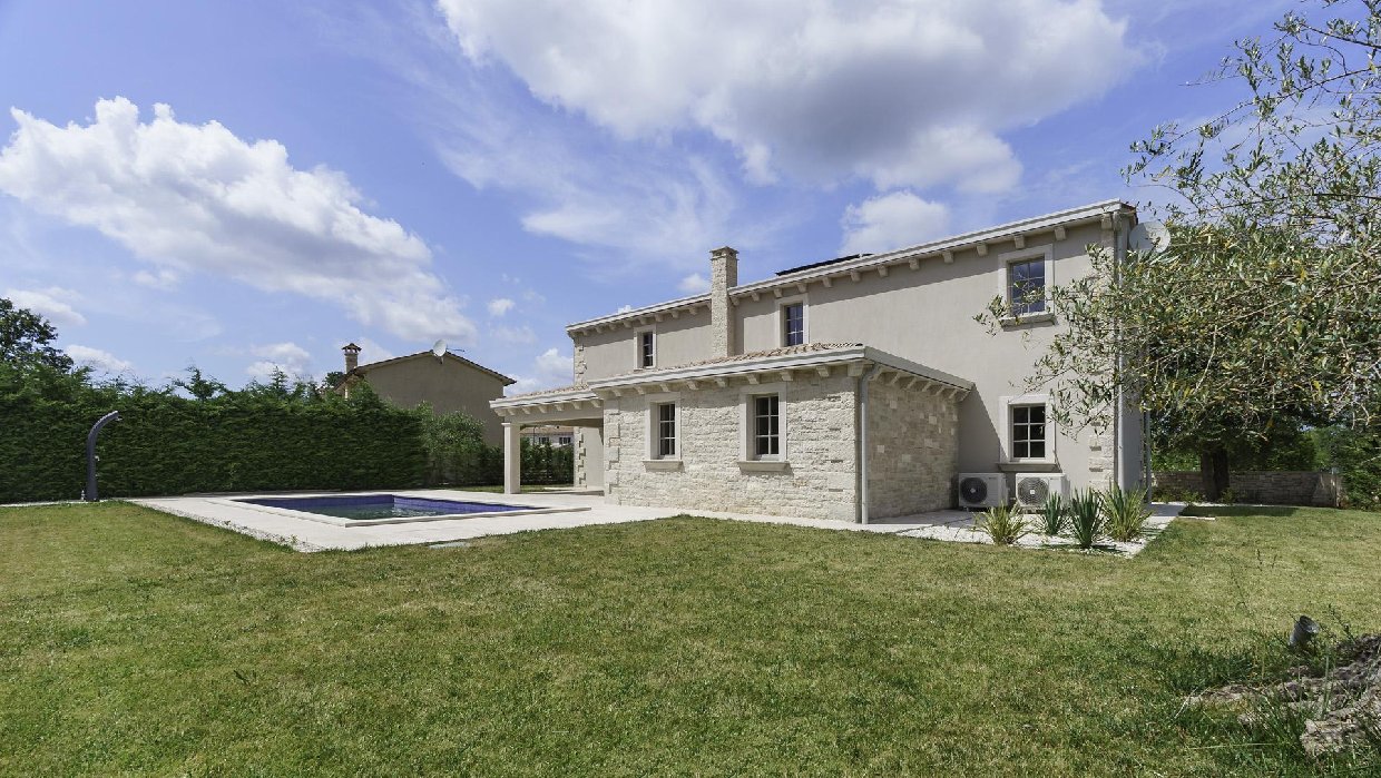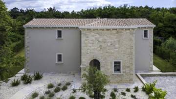 A rustic villa with a swimming pool is located near the picturesque medieval village of Barban. This beautiful villa with a living area of 181 m2 is located on a large plot of 766 m2 with a 32 m2 swimming pool. Surrounded by greenery and other autochthonous stone houses in the village of Rajki and villas with swimming pools, which in recent years have experienced a flourishing of elite tourist offers and unforgettable vacations, they form a harmonious whole and a perfect opportunity to buy this unique property. In the ground floor of the villa there is a bathroom, a spacious bedroom and a multi-purpose space of a living room with a fireplace and a kitchen with a dining room, which are seamlessly connected to the exterior of the villa through large glass surfaces, from which there is access to the lounge relaxation area to the outdoor swimming pool with a sunbathing area. On the floor, which is reached by an interior exotically designed staircase, there are three large bedrooms with en-suite bathrooms of ultra-modern design, which combine the traditional exterior of the villa with modern interior decoration with a designer's signature. The construction quality of this villa is impeccable, and the project includes central underfloor heating with heat pumps, air conditioners for cooling in all rooms, top-quality insulation and high-quality ALU carpentry with Low-e glass filled with argon, which together brings a high energy certificate A+. The garden has three large parking spaces with access from the road as well as a storage room for props, and the entire garden is planted with autochthonous plants of the Istrian climate with herbs and spices. The villa has a built-in alarm system and a video surveillance system for maximum discretion and a sense of security.