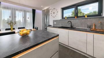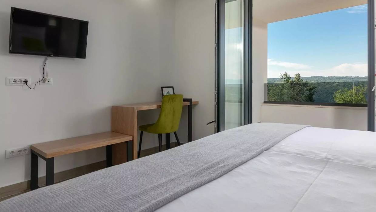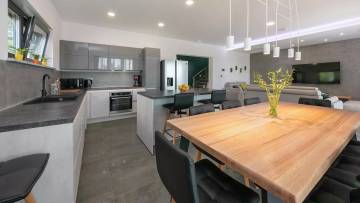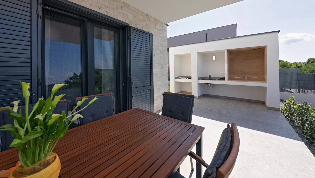 Istra, Labin (okolica) - Dizajnerska vila z ogrevanim bazenom in odprtim pogledom je počitniška hiša sodobne arhitekture, obdana s skoraj neokrnjeno naravo, oljkami in različnimi sadnimi drevesi ter vinogradom z odprtim pogledom. Vila je zgrajena kot nizkoenergijski objekt z uporabo vrhunskih rešitev in izolacijskih materialov. Strešni sončni kolektorji omogočajo pripravo tople vode iz energije sonca, deževnica, zbrana v podzemni cisterni s prostornino 80 m3 pa se uporablja za zalivanje vrta. Ovoj hiše (fasada, strehe in tla) ter vgrajeno stavbno pohištvo zagotavljajo visoko energetsko učinkovitost. Postavljenih je 6 nadzornih kamer, ki pokrivajo skoraj celotno površino vrta, v vseh prostorih pa je nameščen protivlomni alarmni sistem s senzorji. Pokrito in ograjeno parkirišče se nahaja pred hišo. Drsna vrata se odpirajo na daljavo s pomočjo elektromotorja. Ob garažnih vratih so nameščena tudi vrata za pešce z domofonom in kamero.