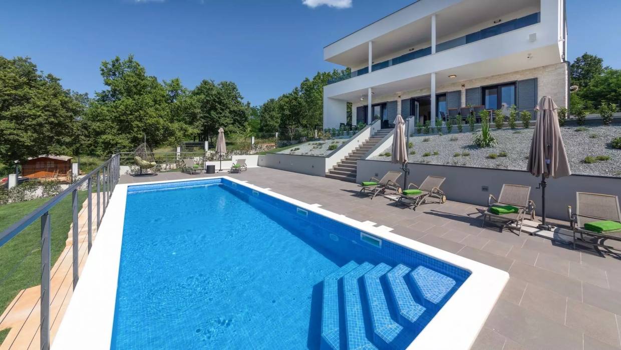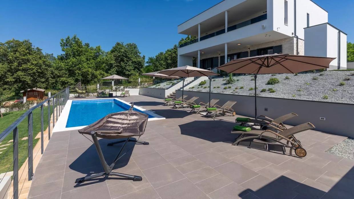 Moderna vila s 4 spalnicami in 4 kopalnicami z odprtim razgledom. Skupna površina objekta je 315 m2; neto površina 243 m2; površina vrta 1.550 m2, bazen 10 x 3,5 m; površina za sončenje 130 m2. V pritličju se nahaja lepo opremljena kuhinja z jedilnico in prostorna dnevna soba z moderno klimatsko napravo in posebnim dekorativnim kaminom, WC, spalnica s kopalnico in shramba. Široka prednja terasa omogoča počitek, zabavo in peko na žaru s čudovitim pogledom na zelene griče, Učko in dolino reke Raše. Ob vhodu je igralnica. Prostorno kopališče z ogrevanim bazenom, napravo za protitočno plavanje in masažo ter prefinjeno razsvetljavo bo bodočemu lastniku zagotovilo popoln užitek.