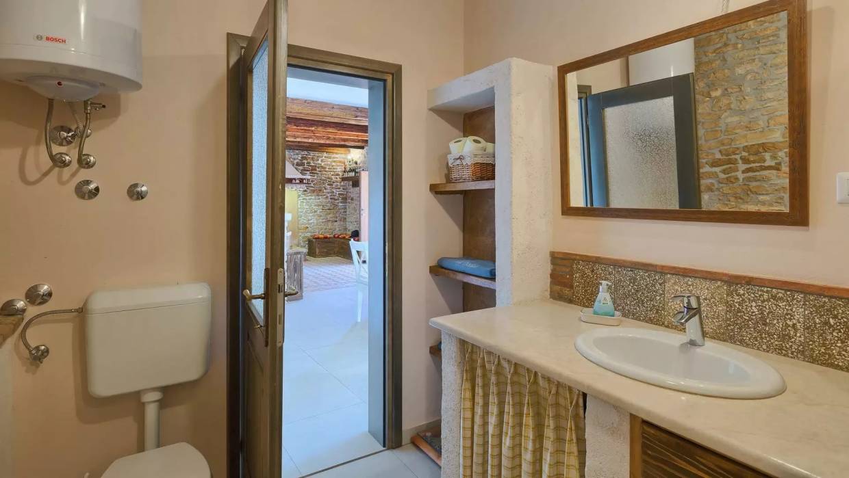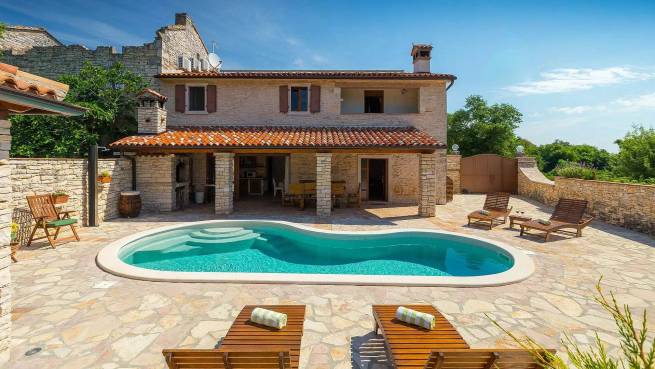 This lovely traditional stone house has three bedrooms and two bathrooms. It has been beautifully restored with a lot of character. There are lots of original features like the old tiles in the living room. All of the bedrooms are comfortable and air-conditioned. A covered terrace with a barbecue provides the perfect dining area next to the stone-decked pool which is surrounded by stone walls providing complete privacy. The villa is at the end of the village immersed in a relaxing natural environment and therefore ideal for family activities, romantic getaways, and relaxation. Villa is one of the first housing objects in Istria rewarded with an eco certificate which guarantees that you are staying in an eco-friendly villa. In order to get the certificate, the villa had to meet conditions such as using eco-friendly detergents and recycling. The idea of the project is to make Istria a “green region” and to limit the impact the villas have on the local environment. A dry steam cleaner in the villa guarantees a clean and safe environment.
