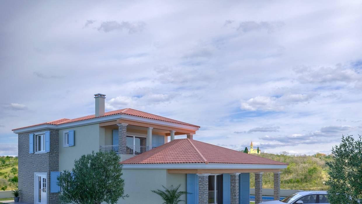 Villa under construction of 250 sqm on a plot of 670 sqm overlooking the hilly Istrian landscape and the sea. The ground floor of the villa has a kitchen with dining area, living room, toilet and bedroom with bathroom and a spacious covered terrace. Upstairs are two bedrooms, each with its own bathroom and terrace. In the outer part of the villa is a green area with automatic irrigation, two parking spaces, sun deck and infinity pool measuring 10 x 3.70 m. Heating system with underfloor heating, and cooling with fencoilers and solar for domestic hot water