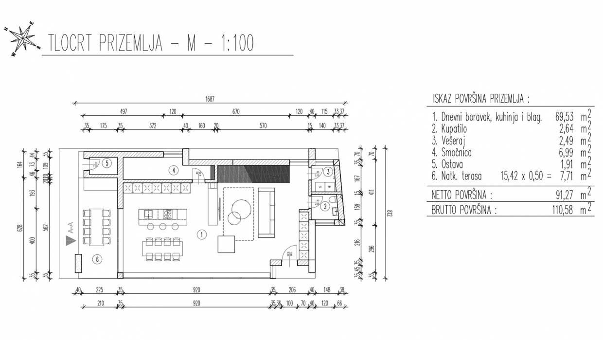 The villa consists of three floors and on the ground floor there is a living room with a kitchen, dining room, storage room and toilet. A modern staircase leads to the first floor where there are two bedrooms, each with its own bathroom and access to the terrace. In the attic there is a third bedroom with a bathroom and a large terrace with a panoramic view of the sea
