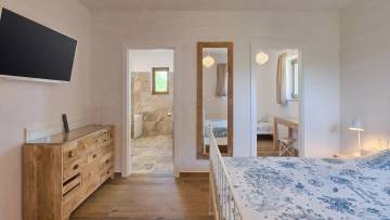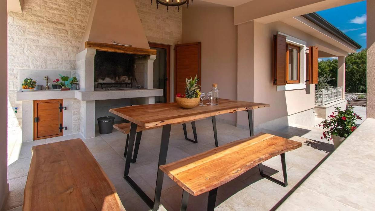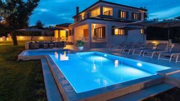 A beautiful spacious villa with pool and with surface of 250m2 that spreads on two floors. On the ground floor of the villa there is a spacious living room with a functional fireplace, kitchen, dining room, two terraces with their own tables for socializing, one bedroom with bathroom and guest toilet. An internal staircase leads to the upper floor that consists of 3 bedrooms, each with its own bathroom. One of the rooms has an additional multipurpose room.