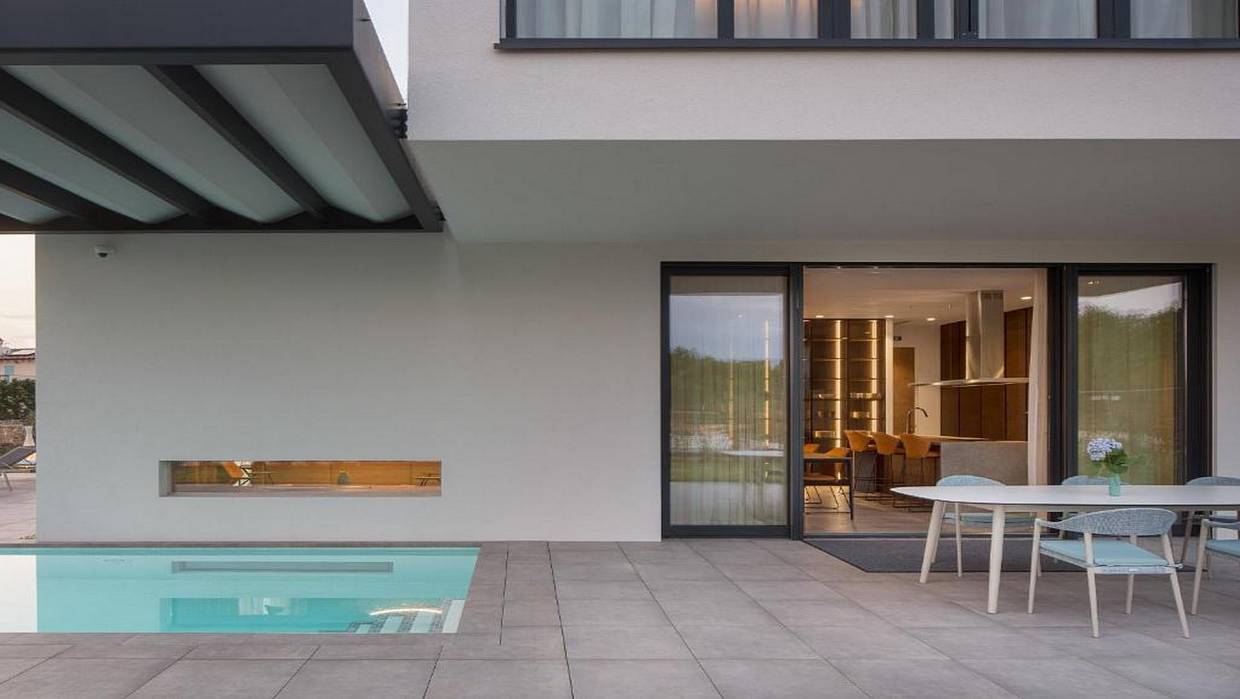 This luxury and beautiful designed villa is located near beautiful town of Rovinj, in a quiet blind alley. The ground floor of the villa has a modern living room, a fully equipped kitchen and dining area, and huge, fully equipped outside area with dining tables, lounge furniture and sun loungers. Carefully maintained, large garden, is completely fenced and surrounded by green hedge, has its own watering system and it`s well illuminated during the nights. In the basement of the villa, there is a wellness area with an indoor pool and sauna, and for game lovers, there is a game room with kitchen and wine fridge, billiard, darts, table soccer and seating area with game console and large LED TV set. The villa consists of two completely identical modules connected by the basement. The first floor of the villa is intended for bedrooms that have en suite bathrooms. Large glass surfaces and a view of the greenery give the villa freshness and spaciousness. This spacious, modern, unique villa, offers full comfort and it is fully air conditioned with heating system (heat pump). Living rooms and most of the bedrooms are oriented towards the west, and exposed to the sun for almost the whole day through huge glass surfaces, which can be electrically shaded. The villa is just 5 minute drive from the beautiful beaches. The villa is carefully decorated with unique design elements and top of the notch, high quality furniture.